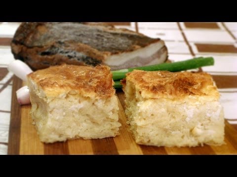 Mischen Sie mit einer Gabel Hüttenkäse, Eier, Käse, Milch und einen halben Teelöffel Backpulver, das Sie zuvor in einem Deziliter Wasser aufgelöst haben. Mischen Sie, bis Sie eine halbflüssige Masse erhalten (mit Käseklumpen und Hüttenkäse). Fetten Sie die Backform ein und legen Sie eine wellige Teigschicht darauf, die Sie mit Öl übergießen. Nach dem Teig die Masse bestreuen und mit der nächsten Teigschicht bedecken. Falten Sie diese so, dass die Wellen jetzt senkrecht zur vorherigen Schicht stehen. Den Teig erneut einfetten. Wiederholen Sie das Ganze noch zweimal (insgesamt vier Teigschichten), sodass jede Schicht senkrecht zur vorherigen steht. Dann die restliche Masse darüber verteilen. Noch einfacher ist es, das Backblech mit Blätterteig auszulegen und den restlichen Blätterteig zu einer Kugel wie Zeitungspapier zu knüllen, in die Mischung zu tauchen und in das Backblech zu „knüllen“ (eine einfachere Demonstration finden Sie im Video). Backofen auf 180 Grad vorheizen und etwa 30 Minuten backen. Guten Lauf!