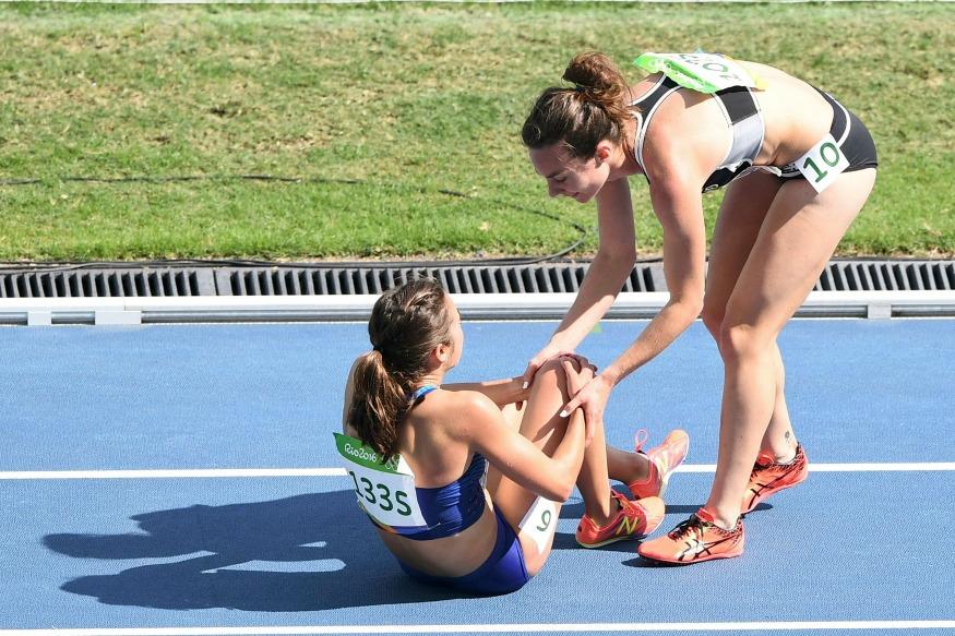 Jogger an 5000 Meter Sie verhedderten sich und stürzten etwa 2.000 Meter vor der Ziellinie. Ihre Träume von einem guten Auftritt wurden augenblicklich zunichte gemacht. Ein Läufer Sie gaben nach dem Sturz nicht auf, halfen sich sportlich gegenseitig und beendeten das Spiel gemeinsam. Die US-Amerikanerin verletzte sich bei dem Sturz am Knie und forderte die Neuseeländerin auf, weiterzulaufen.