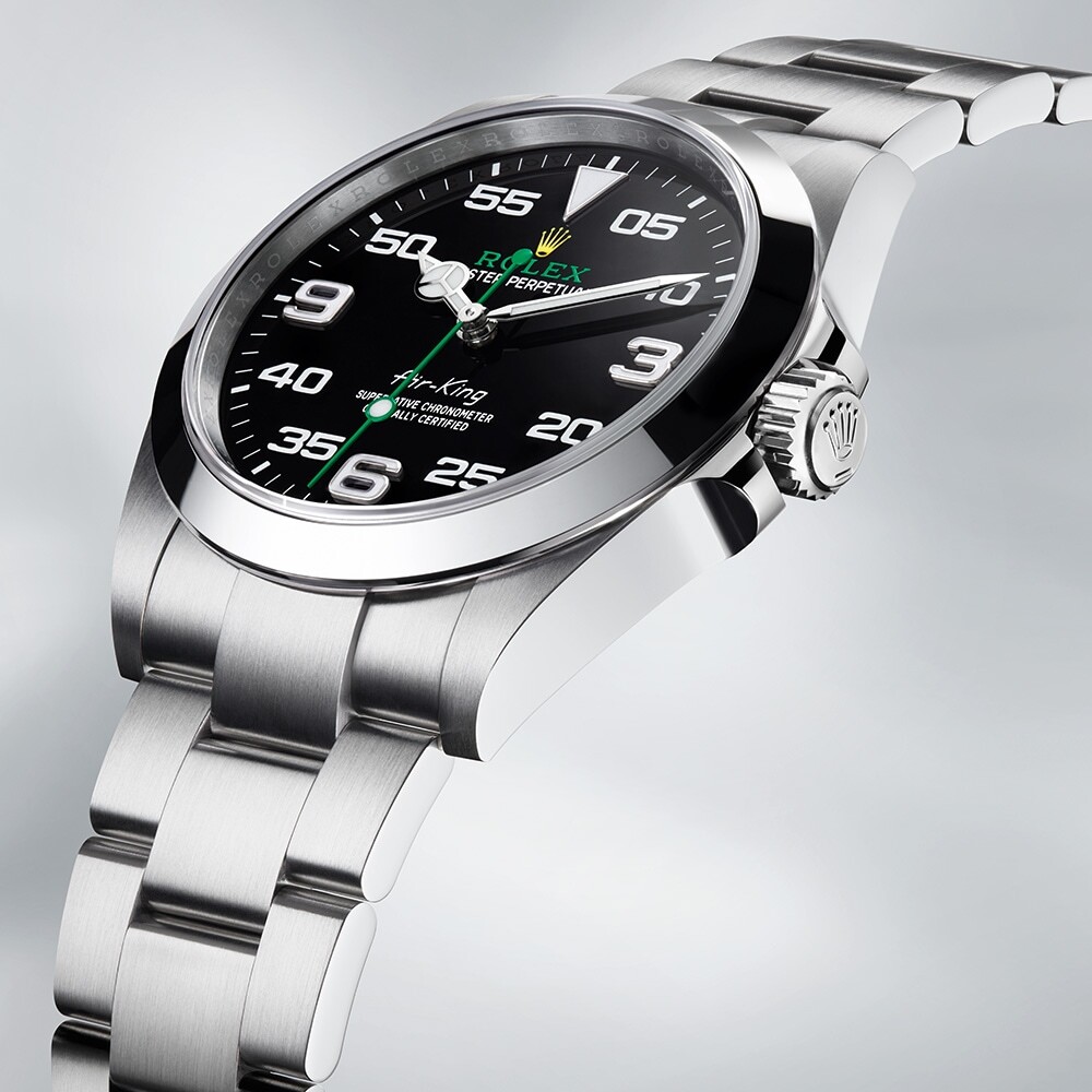 Rolex präsentiert die neue Generation der Oyster Perpetual Air-King. Die Uhr hat ein komplett neu gestaltetes Gehäuse mit Kronenschutz und flachen Seiten wie die meisten Modelle der Professional-Kategorie. Auch die Proportionen des Armbands wurden verändert und vor allem die zentrale Verbindung des Motivs selbst erweitert. Als Premiere für das Modell ist sie mit einer Oysterlock-Sicherheitsschließe ausgestattet. Auch die Uhrenanzeige wurde aufgefrischt und ist durch die Hinzufügung von 0 vor 5 auf der Minutenskala perfekt ausbalanciert. Jedes Fünf-Minuten-Intervall wird daher jetzt mit zwei Ziffern gekennzeichnet.