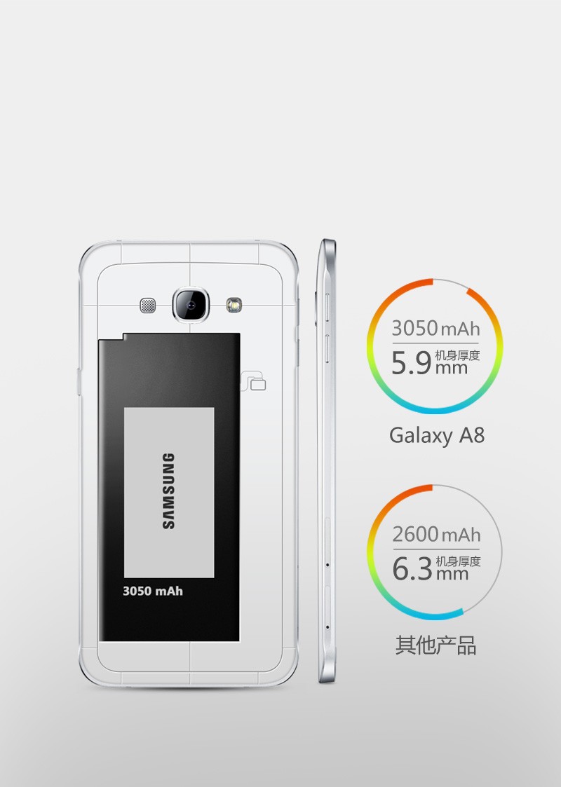 Unter 5,7-Zoll-Bildschirm Super Amoled ločljivosti 1920 x 1080 slikovnih pik najdemo 8-jedrni in 64-bitni procesor Snapdragon 615. Temu statirata 2 GB Systemspeicher, ki ”dojita” operacijski sistem Android 5.1 Lutscher s hišnim vmesnikom TouchWiz. Telefon Galaxy A8 bo imel na voljo 16 GB oziroma 32 GB vgrajenega pomnilnika, z možnostjo razširitve s pomnilniško kartico microSD bis zu 128 GB. Kljub ploščatemu trebuščku ima precej zmogljivo baterijo s kapaciteto 3050 mAh, nudi pa tudi podporo omrežju 4G/LTE. Zadaj nas čaka fotoaparat ločljivosti 16 milijonov slikovnih točk (z zaslonko f/1,9), spletna kamera na čelu pa jih je naštela 5 tisoč.