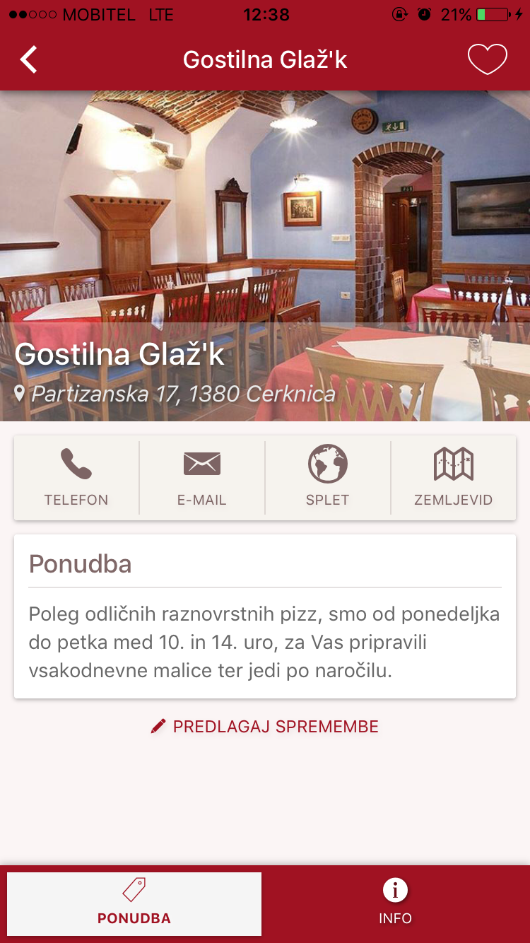 Bei eingeschalteter Standortinformation werden Ihnen die aktuell nächstgelegenen Anbieter angezeigt und Sie gelangen mit Hilfe der Navigation und der eingeschalteten Ortung auch zur gewünschten Adresse. Die Anwendung ist transparent und einfach zu verwenden. Es ermöglicht auch Filterung nach Angebotsart bzw Deine Wünsche, und Sie können eine Liste Ihrer bevorzugten Anbieter erstellen und haben so den kürzesten Zugriff darauf Aktuelle Informationen. Die Liste umfasst über zweitausend Anbieter aus ganz Slowenien. Es ist für mobile Geräte mit Betriebssystem verfügbar iOS und Android.