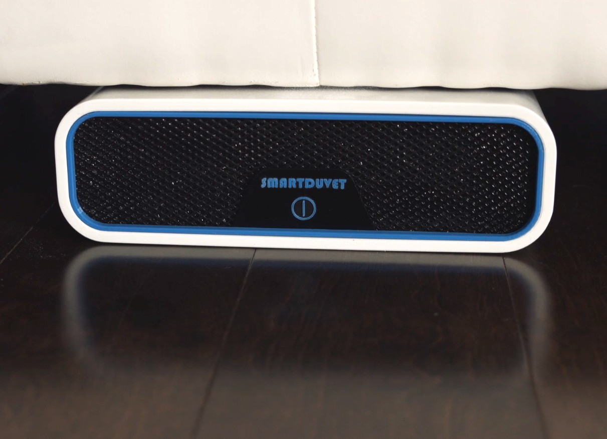 SmartDuvet Breeze ist seinem Vorgänger recht ähnlich. Ein Fall von selbstaufblasende Decke, die Sie in den Bettbezug einlegen. Dann stecken Sie es ein zum Leitsystem, die Sie unter dem Bett verstecken können.