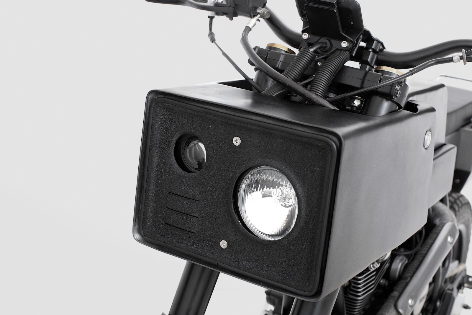 T 005 Kreuz ist komplett maßgefertigt. Aber vor allem seine viereckige Form, die wir bei dieser Art von Motorrad nicht gewohnt sind, wird ins Auge fallen, denn abgesehen von seinem frechen Aussehen ist es kein Freund von Aerodynamik und Kraftstoffverbrauch. Damit das Team an Gedeihen Sie Motorräder, welches ist viereckiges Motorrad gemacht, bot dem Fahrer viel Kontrolle, sie hoben das Lenkrad etwas an und installierten eine spezielle Kupplung darauf und Smartphone-Halter.