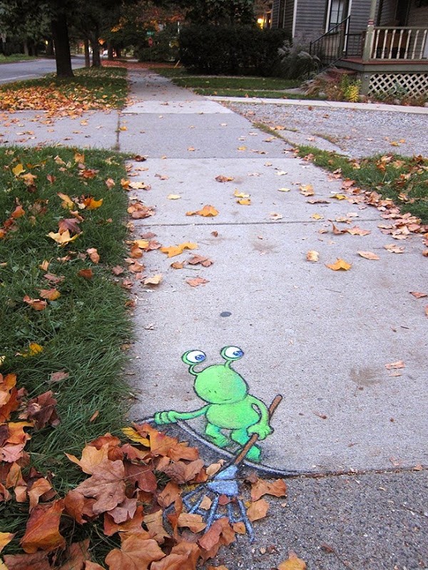 David Zinn Orte für Ihre Lieben Kreide Illustrationen Wählen Sie immer sehr sorgfältig aus, da sie einen großen Teil der gesamten Komposition ausmachen. Einer seiner bekanntesten Charaktere ist Sluggo, ein seltsames, grünes, außerirdisches Monster. Er lässt seine Zeichentrickfiguren lebendig erscheinen, verleiht ihnen ein fast dreidimensionales Aussehen und stellt einen Kontakt zu ihnen und ihrer Umgebung her. Die meisten der niedlichen Zeichnungen erscheinen auf den Bürgersteigen in Ann Arbor, Michigan, wo Zinn herkommt, aber einige sind auch auf den Straßen von Manhattan, New York, aufgetaucht.
