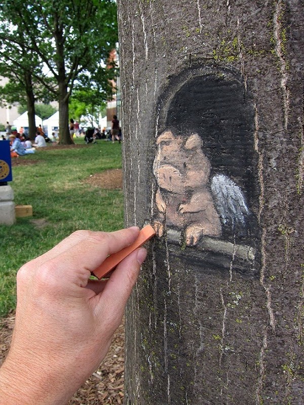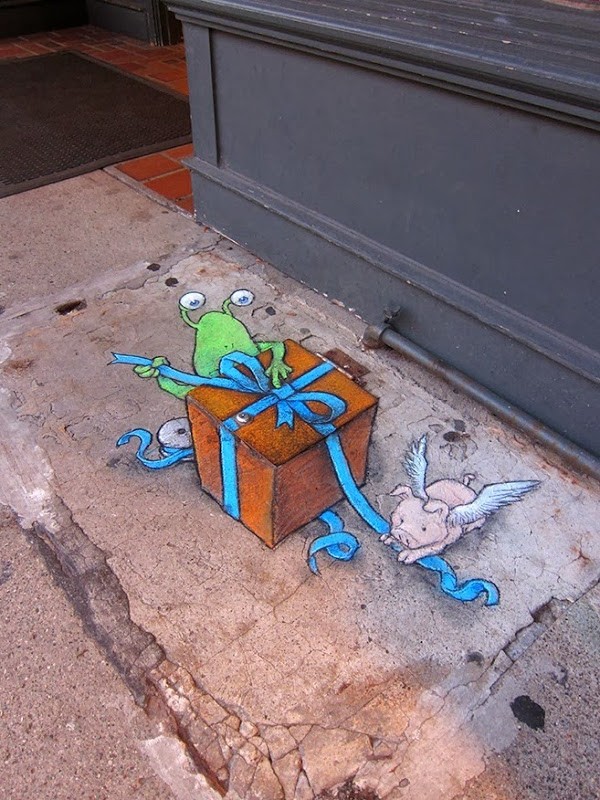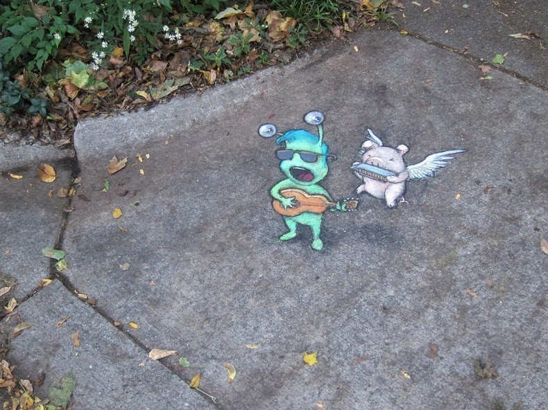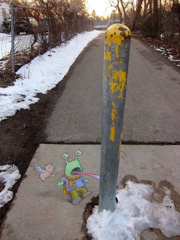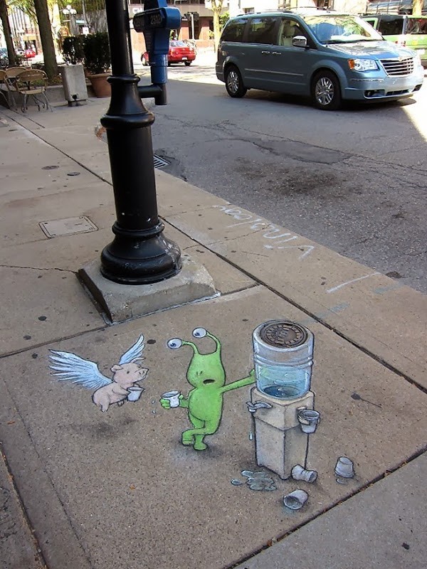 Seit 2001 hat der Künstler David Zinn zahlreiche Straßenillustrationen mit Kreide auf den Bürgersteigen seiner Heimatstadt Ann Arbor geschaffen.