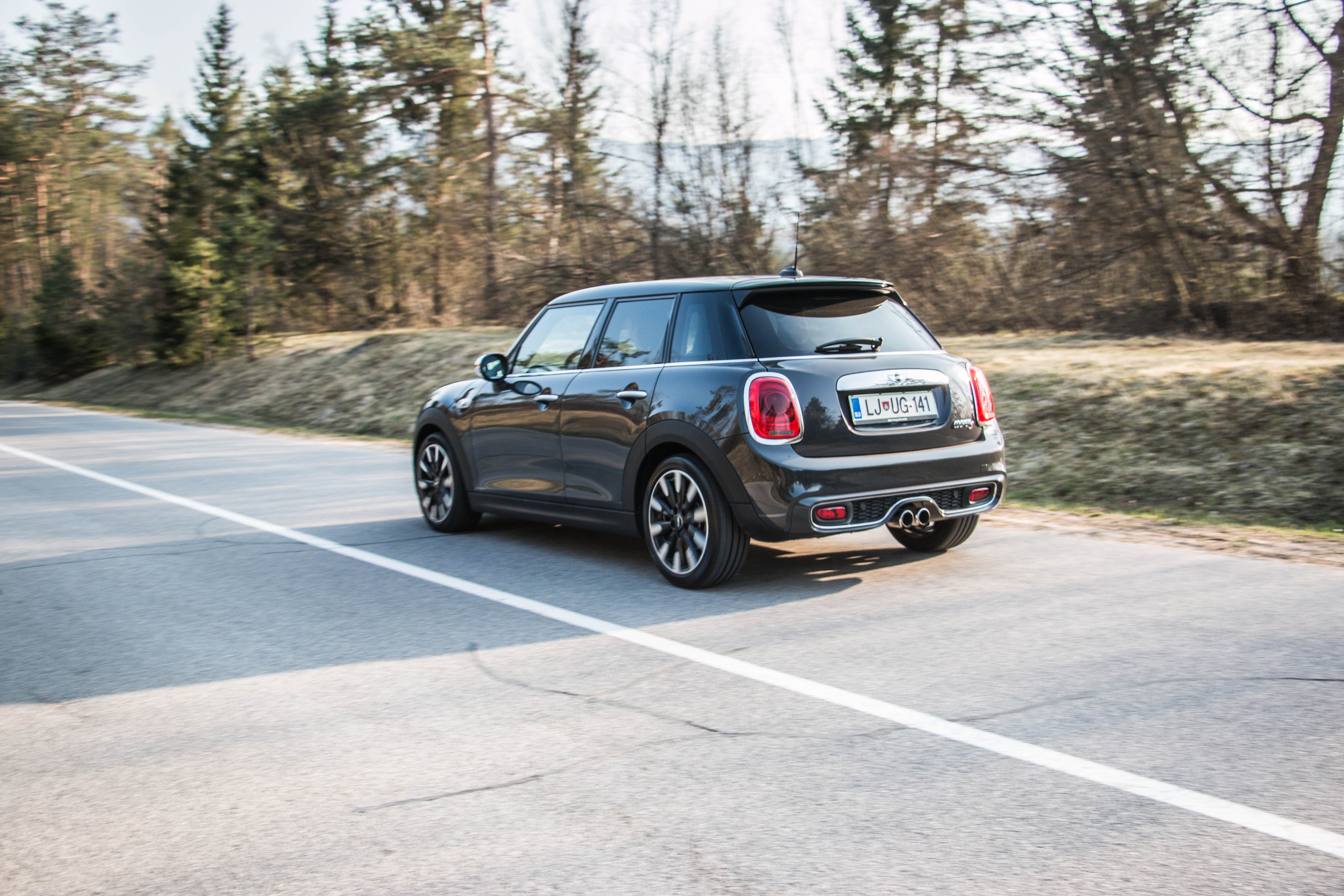 Motor lepo vleče in je prostorninsko večji od predhodnka. Tudi to mu očitno pomaga do tega da je bolj odziven in da turbo luknje ni čutiti pretirano. Še vedno je nekje tam spodaj… a ko se Mini Cooper S predrami se lahko začne veselje. Med vožnjo se nekako nisem mogel otresti občutka, da ta avtomobil zmore še več, da hoče še hitreje, a ga nekaj ovira. Zato po vsej verjetnost obstaja različica JCW. V primerjavi s 3 vratnim ni pretirane razlike, občutki so v osnovi enaki, a vseeno malček drugačni. A to so že finese, ko z avtomobilom letite v ovinek, od avtomobila pa zahtevate 120% in takrat nekje v zadku občutite tistih nekaj Zentimeter und Kilogramm, ki spreminjajo razmerja sil. Takrat veste, da bo vaša boljša polovica jezna, tašča na zadnjih sedežih pa vam zna v čaj vmešati oleander. A ko se cesta zravna, odpre in postane 2 pasna, Cooper S pospešuje magično od 100 km/h proti svojim limitom. In zdi se da ni konca, da je vse skupaj izjemno hitro in skoraj poetično. Sedite namreč nizko, pogled na črnino asfalta pa je drugačen kot pri drugih avtomobilih. In zato so občutki drugačni kot v katerem koli drugem avtomobilu.