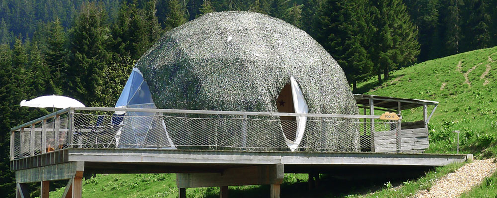 Ein wegweisendes Konzept von architektonisch beeindruckenden „Zelten“ genannt Hülsen, auf Holzplattformen platziert, verbirgt sich traditionelles Interieur, fortschrittliche Isolierung und Heizsystem und ein Badezimmer mit eigener Wasserquelle. Die Gruppe 15 Häuser im Winter sind sie mit Schutzplanen und im Sommer mit einem Gründach abgedeckt. Außer Entspannung Blick auf die wunderschönen umliegenden Alpen und Genfer See, bietet das Resort auch 7 Kilometer private Skipisten, Restaurant, Bar u Wellness mit japanischem Bad und finnischer Sauna. Weiße Schote und damit genau die richtige Mischung aus erholsamem Aufenthalt in der Natur und aktivem Urlaub.