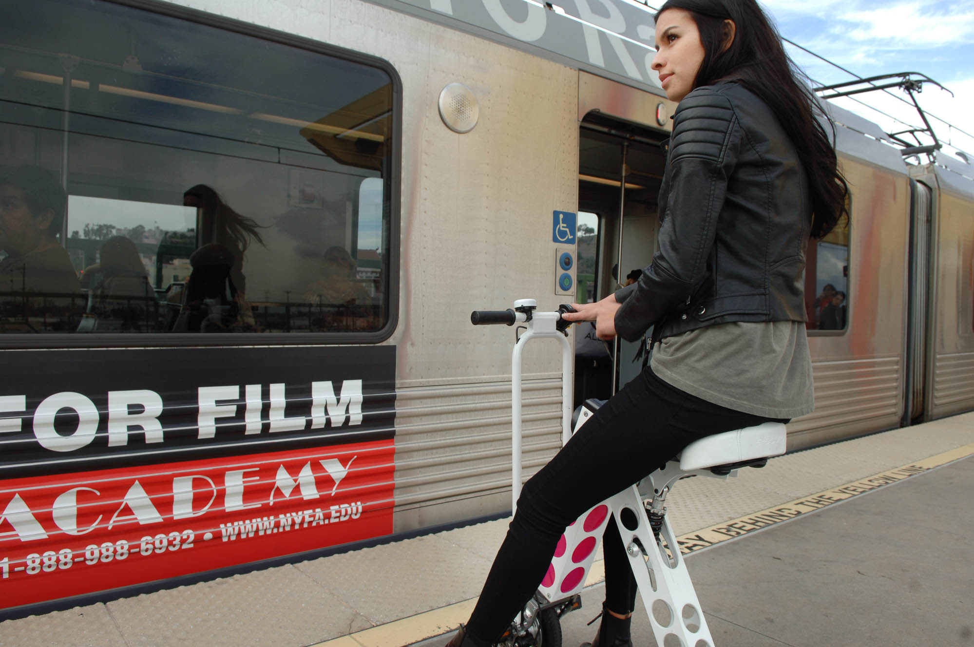 Es gibt einen zweirädrigen Urb-E GP und einen dreirädrigen Urb-E Commuter, die beide lediglich 13 Kilogramm wiegen und im zusammengeklappten Zustand lediglich 40 x 40 x 91 Zentimeter messen. So können wir den Urb-E im Bus mitnehmen und anschließend unsere Besorgungen damit weiter erledigen.