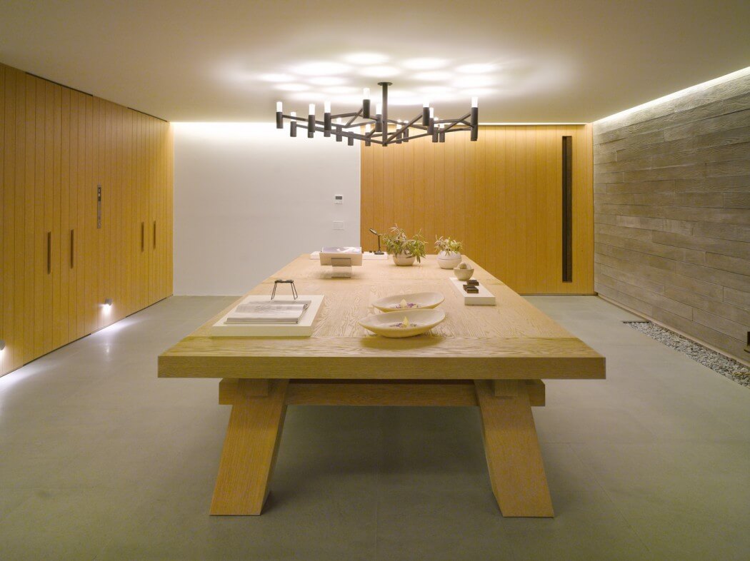 Zusammenschluss natürliche Materialien und Texturen trägt zum ursprünglichen Konzept des Projekts bei: Durch die Verwendung von Naturstein- und Betonwänden entstehen frische Räume, die in heißen Jahreszeiten für passive Kühlung sorgen. Heim im Stil der fünfziger Jahre ist mit erdigen Materialien und Oberflächen wie Betonplatten, grünen Wänden und maßgefertigten Walnussholzmöbeln ausgestattet.