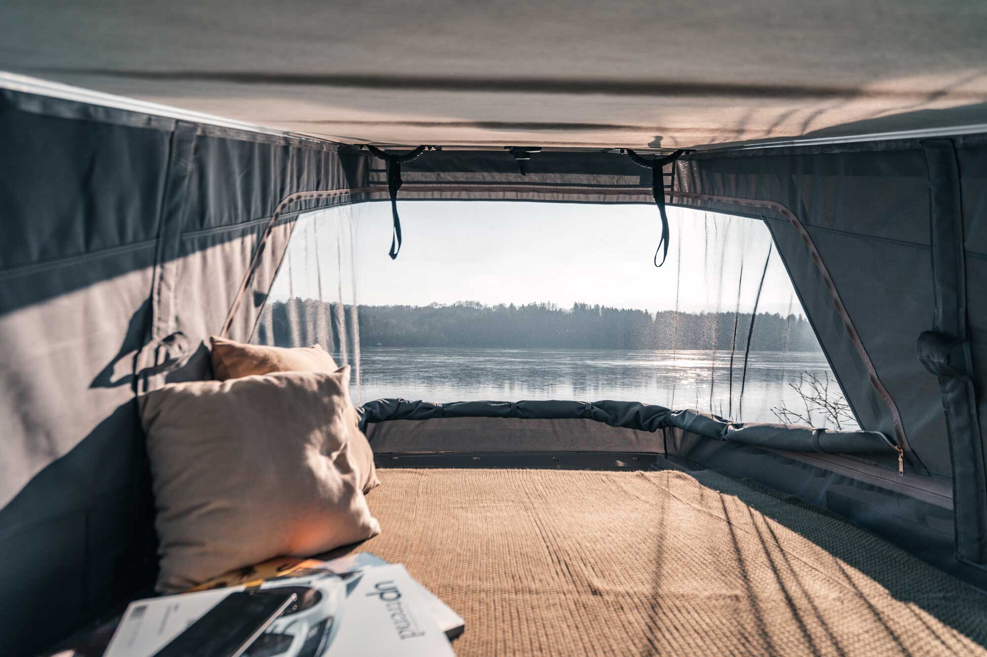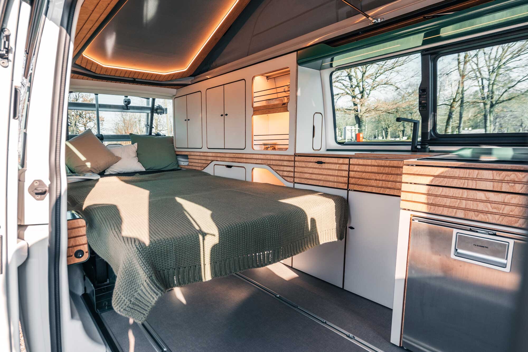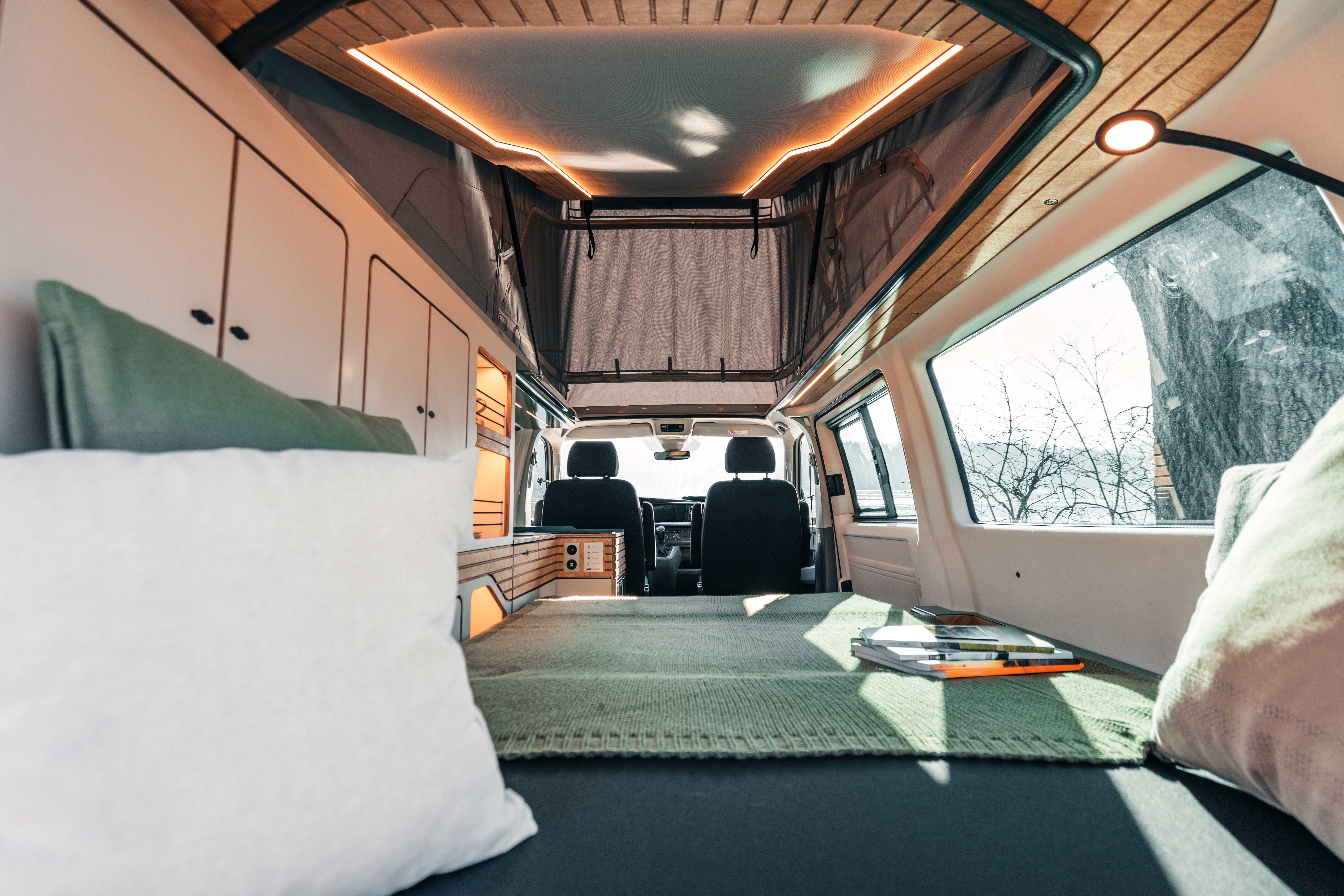 Das Äußere des Wohnmobils ist mit einem Canning-Baldachin, Ambientebeleuchtung und einem Solarmodul ausgestattet, das bis zu 352 Wp Leistung und Versorgung vereint 1900 Wh Lithium-Batterie, wodurch es autark und netzunabhängig betrieben werden kann. Ein Wechselrichter zur Umwandlung von Strom in 220 V ist ebenfalls erhältlich. Bei der Fahrt auf einem Satz 18-Zoll-ABT-Felgen in glänzendem Schwarz, die mit Gummi umwickelt sind Goodyear Eagle F1strahlt die gesamte Ausstattung einen Hauch von Raffinesse und Abenteuer aus.