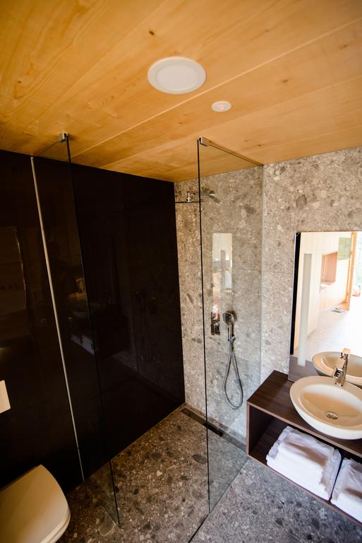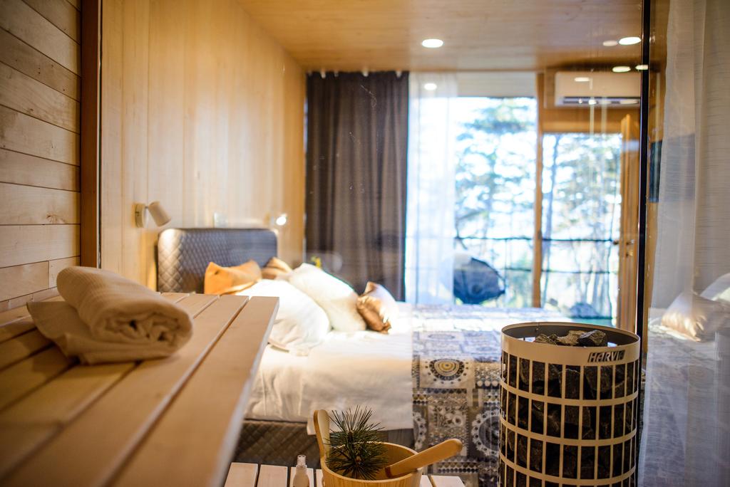 Moderne Holzhäuser fügen sich harmonisch in ihre Umgebung ein. Ausrüstung, die höchsten Komfort und ästhetischen Genuss bietet aus Nanoholz von lokalen Handwerkern hergestellt. Alle Cottages verfügen über einen Balkon und ein eigenes Bad mit Dusche. Ein Kühlschrank, ein Wasserkocher und eine Kaffeemaschine sind ebenfalls vorhanden. Einige Häuser rühmen sich auch mit Outdoor-Whirlpool und Indoor-Sauna. Auch das Entspannen in der Umarmung von Düften und Zirbenessenzen ist ein besonderes Erlebnis Terrasse am Rande des Weinbergs.