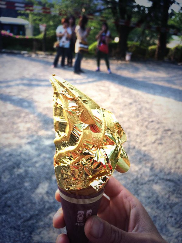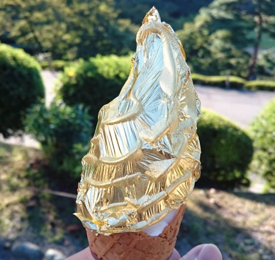 Der Goldrausch nagte an jeder Pore, auch an der Nahrung. Wir erinnern uns nur an Donuts und (Schaum-)Wein mit Blattgold. In der Stadt Kanazawa, der japanischen Hauptstadt des Blattgoldes, wie sie auch genannt wird, kann man sich jetzt auch flüssiges Eis vorstellen, das in essbares Gold gehüllt ist. Und wer jetzt denkt, das sei ein teurer „Spaß“, der irrt, denn schon ab 7 Euro bekommt man diese Art von Eis in den Genuss!