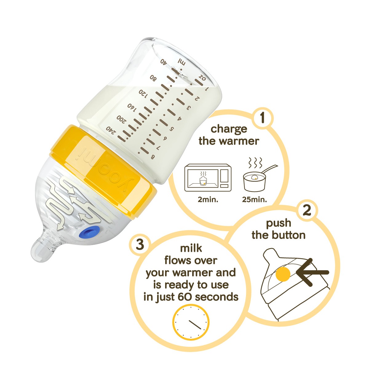 Yoomi-Flaschen sind ideal für aktive Familien, da sie die Flüssigkeit ohne Strom oder Batterien in einer Minute auf Muttermilchtemperatur erhitzen. Glauben Sie es nicht?