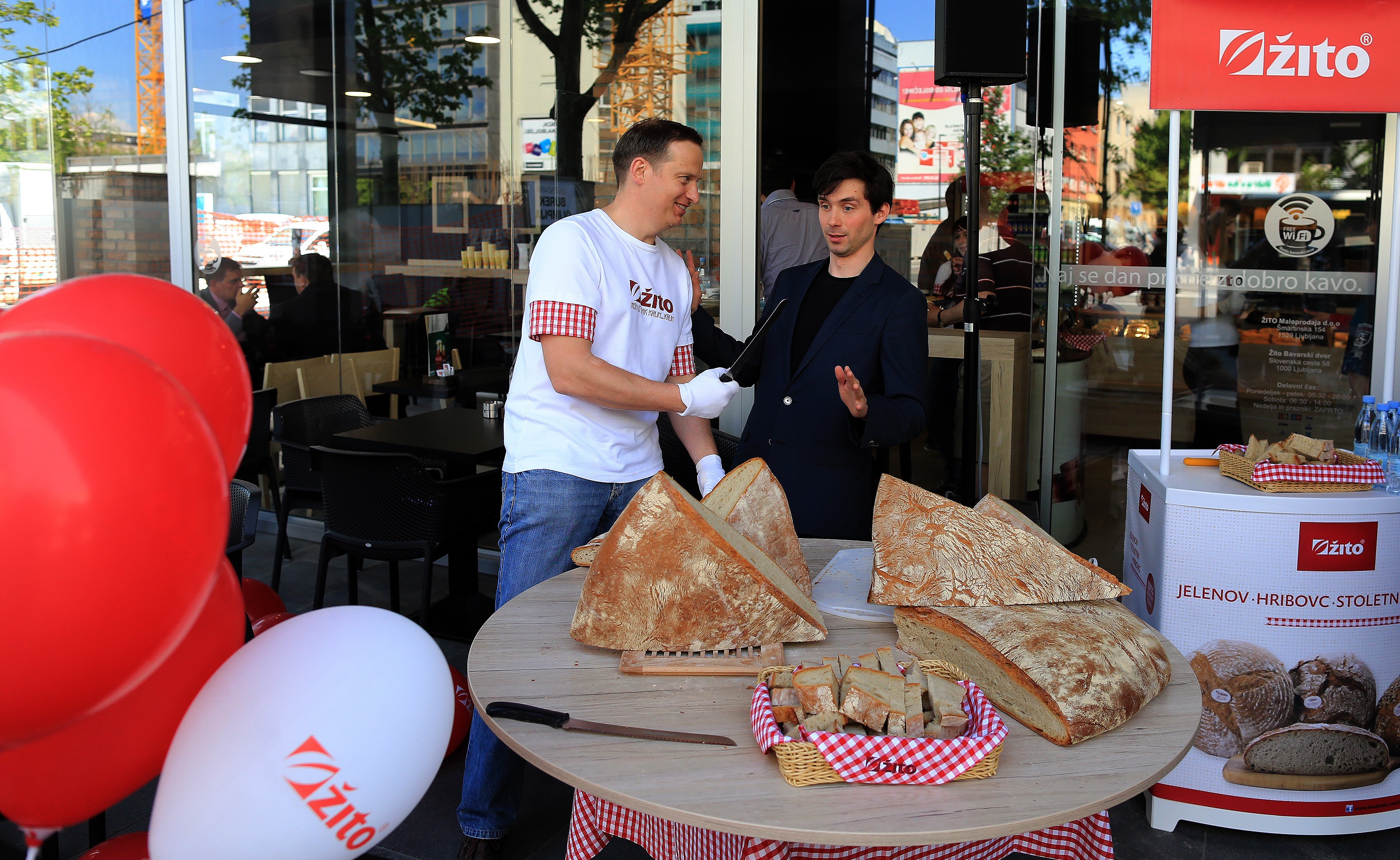 »Ker želimo v Žitu ponuditi sveže in kakovostno pripravljene izdelke, jih pripravimo ali dokončamo kar v novem lokalu. V gostinskem delu so na voljo tudi sveže slaščice, od kremnih rezin do svežih tort,« erklärt direktor Žitove maloprodaje Tevž Tavčar. Najbolj okusno in zabavno malico v mestu so pospremili s peko in razrezom mega Jelenovega kruha, enega najbolj prepoznavnih Žitovih krušnih izdelkov, ki je narejen iz 100 % slovenske pšenice. Tehtal je 20 kg in imel 1,2 m premera.