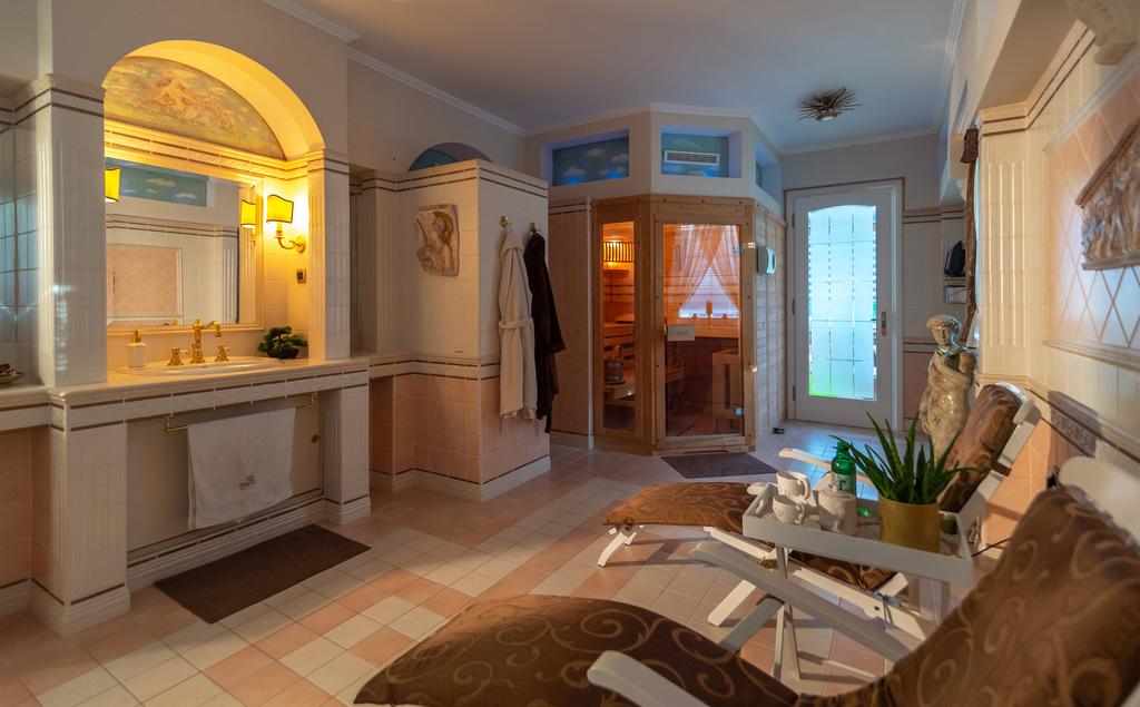 The villa has three bedrooms and two bathrooms, and each room is really luxuriously furnished - animal prints, strong colors, royal furniture, marble, artwork on the walls... Like every real villa, Karavla also has its own wellness with massage tub and sauna, external private pool and vrt where you can sit in privacy.