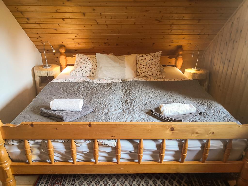 On the ground floor of the house there is a living room with a fireplace, a dining room, a kitchen, a sleeping area and a toilet, and on the first floor there are two separate bedrooms with bathrooms. Pleasant, elegantly designed and custom-furnished rooms create a warm atmosphere, and large triangular windows offer exceptional views. Both bedrooms also have a balcony. Towels and bed linen are provided. For pampering, they have prepared a wooden tub for you, which is located behind the house, where you will enjoy relaxing moments in the rustle of the birch shade.