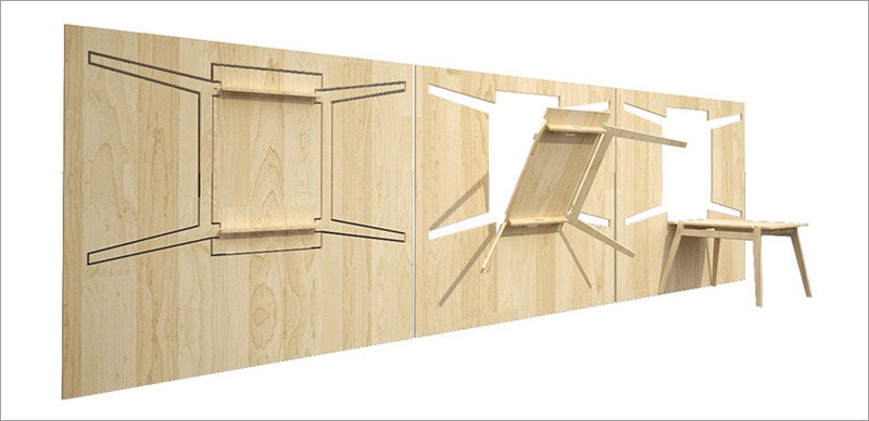 The table is cut from wooden wall panel, into which it is stored when not in use like a piece of a puzzle.