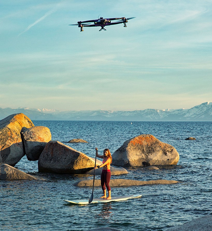 The drone is operated waterproof, a lightweight tracking device Airleash, which enables take-off and the first adjustments by simply pressing a button. No remote controls, that is. You will be able to use the illuminated interface even in low light conditions. You will enter your route, along which the drone will follow you, into the device before the adventure. Alternatively, if you think that many obstacles await you, you can set a special program that will further increase the level of safety against collisions and impacts. In areas that pose less danger to the drone, you can set different programs that will enable special effects and shooting angles.