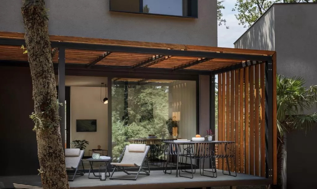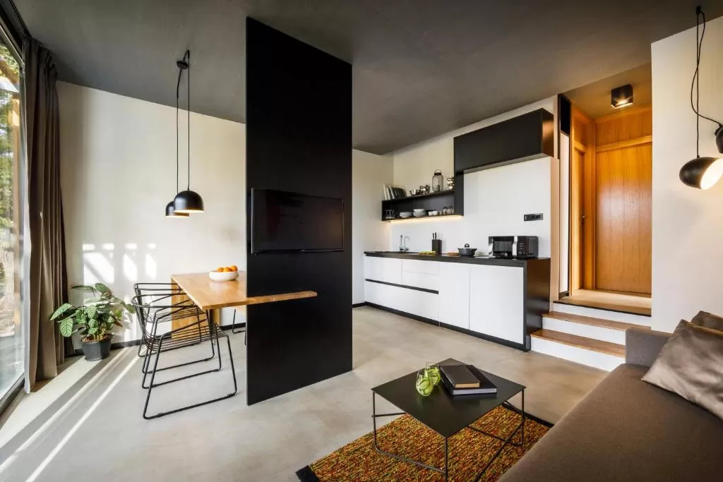 Scope installation several villas of different sizes, for couples as well as families or groups of up to 8 people. Each villa boasts comfortable furniture, a spacious terrace and large glass surfaces through which you can observe the green surroundings. In the bedroom, the smell of the nearby forest will lull you to sleep, and in the morning you will be accompanied by the smell of Mediterranean herbs.