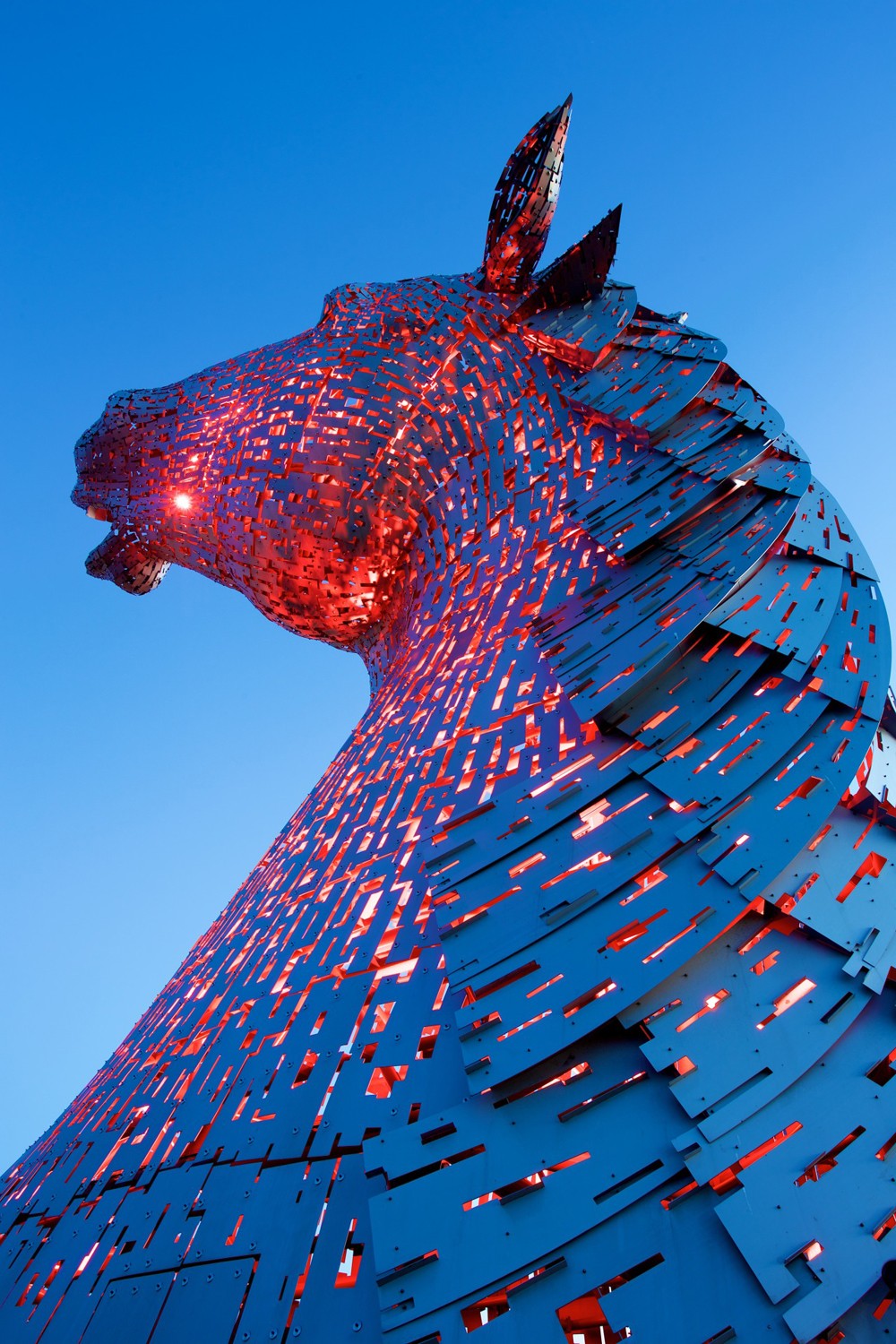 The 30-foot-tall and luminous sculpture The Kelpies in Falkirk, Scotland, consisting of a pair of enormous horse heads, was erected by artist Andy Scott.