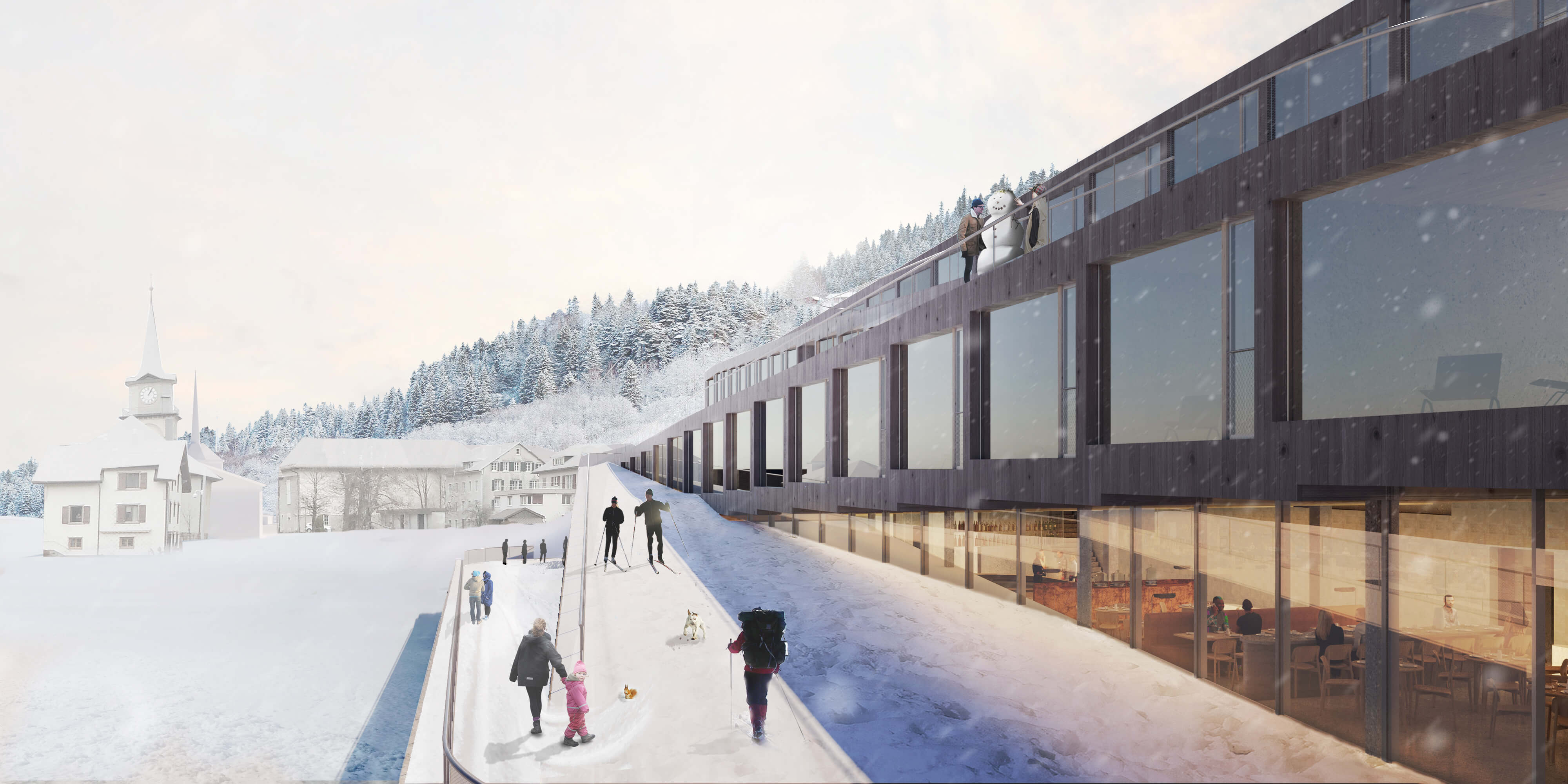 The public's attention is mainly attracted by the unique design. The hotel is designed in such a way that in winter it allows visitors to ski from their room to the museum or the Vallee de Joux ski area.