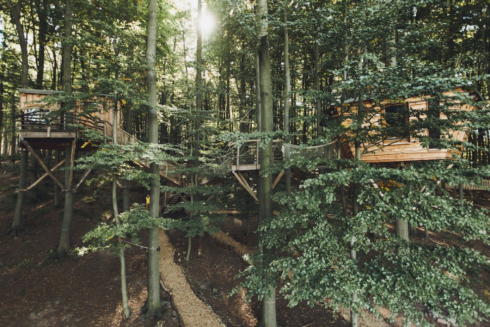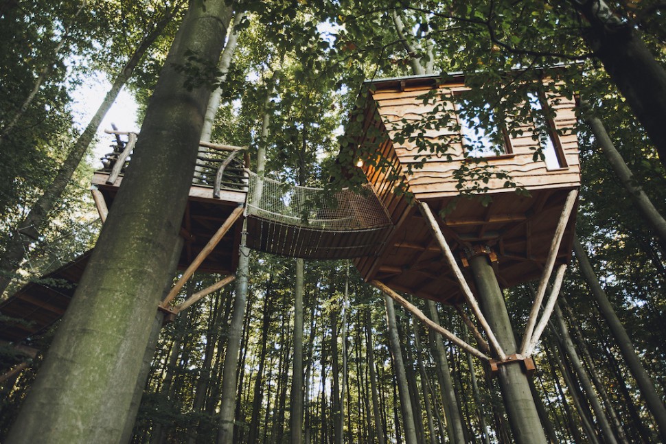 Baumhotel Robins Nest it is a charming hotel among the canopy, which is hidden in the forests of the German federal state of Hessen. There are seven different holiday accommodations, of which three are raised off the ground and four stand on solid ground. Every hut has unique style, but all are joined together by wooden furniture, electricity and heating. Compost toilets are shared and showers are separate.