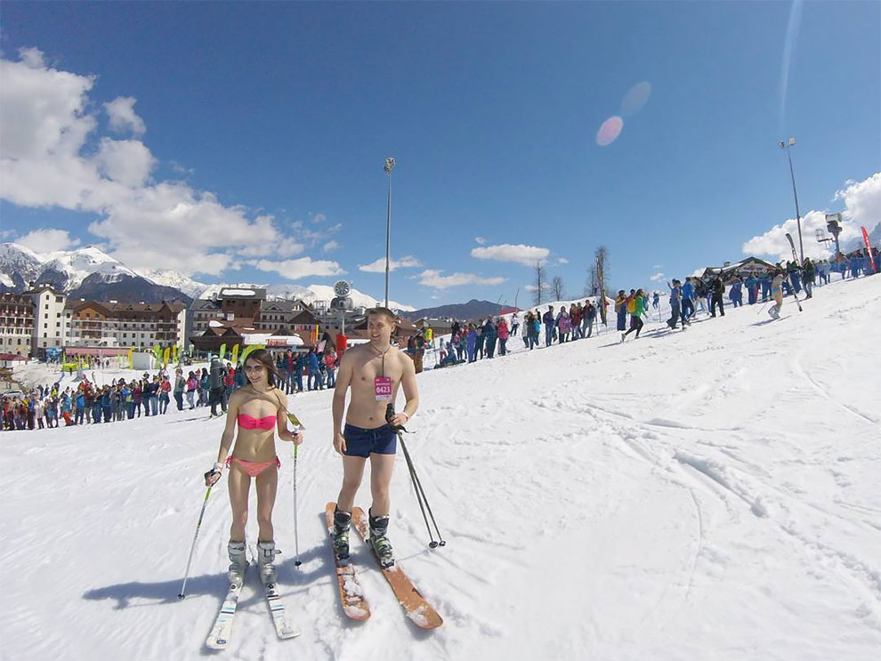 At the end of the winter season, the temperatures were already so high that you could really ski or surfed in bathing suits. Well, in the Russian ski resort of Rosa Khutor in Sochi, they did just that. Namely, the second BoogleWoogle swimsuit skiing festival was recently held there, where the participants put on swimwear instead of overalls.