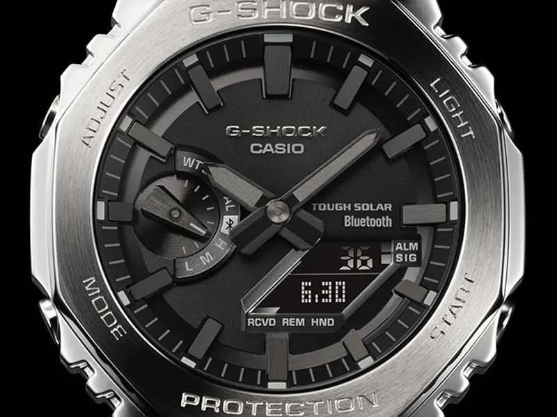 Casio G-Shock GMB2100 is a robust metal "upgrade" of the successful G-Shock GA2100 model. The GMB2100 wristwatch connects the quartz movement that powers it solar energy, with a traditional analog dial that hides a bunch of advanced electronic solutions underneath. The watch shows the world time of 38 well-known cities, up to 5 daily reminders, a stopwatch, a countdown timer, and via a Bluetooth connection with the app, the watch automatically checks and sets the exact time four times a day.