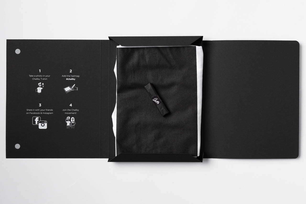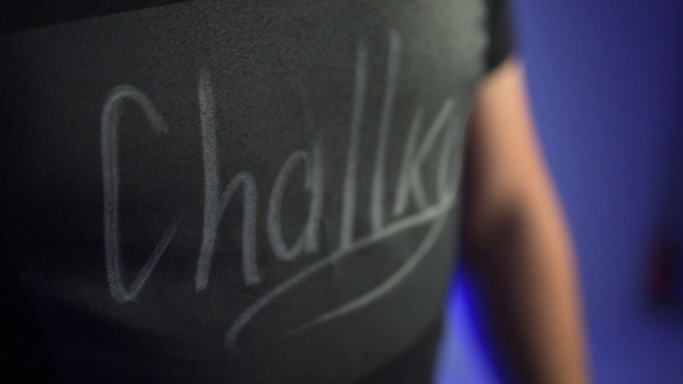 The Challky t-shirt has a special surface, similar to a school blackboard, on which you create with chalk, which comes with the t-shirt. And if you don't like the finished product, take a damp sponge and simply wipe off what's on the 'board' and start over.