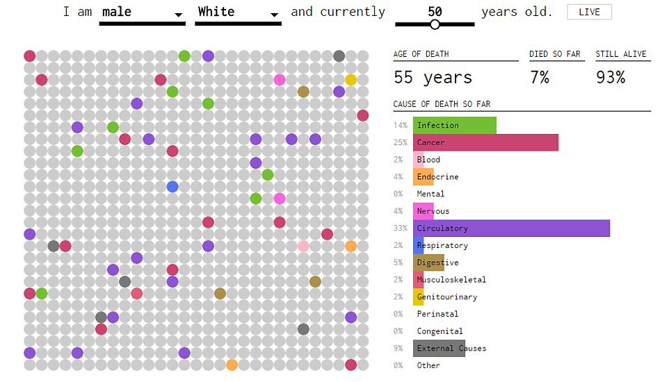 How does the table work? After you enter your gender, race, and age, you're presented with a little sea of colored dots. A case of animated simulation, which shows the various probabilities of death from the entered age all the way to 100 years old. So you can see the percentage of people who died at a certain age, and you can also check for each year cause of death and how it varies by age. When we are younger, we are somehow more likely to die from an external cause, but when we are older, the reason is internal in nature. Will you try?