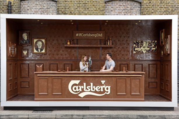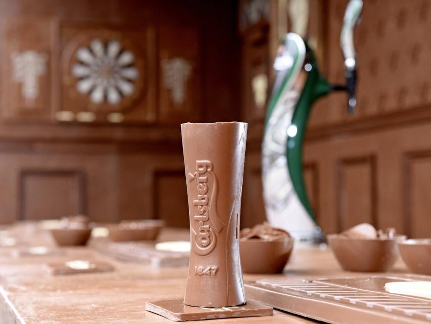 The Chocolate Bar is a pop-up pub made entirely of chocolate. The pub is the Carlsberg brewery's answer to the question no one asked: ''What if Carlsberg made chocolate bars?'' The answer is an edible and functional pub where beer is served behind a chocolate counter in chocolate glasses.