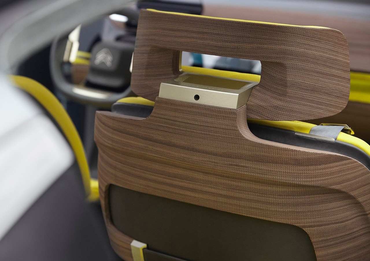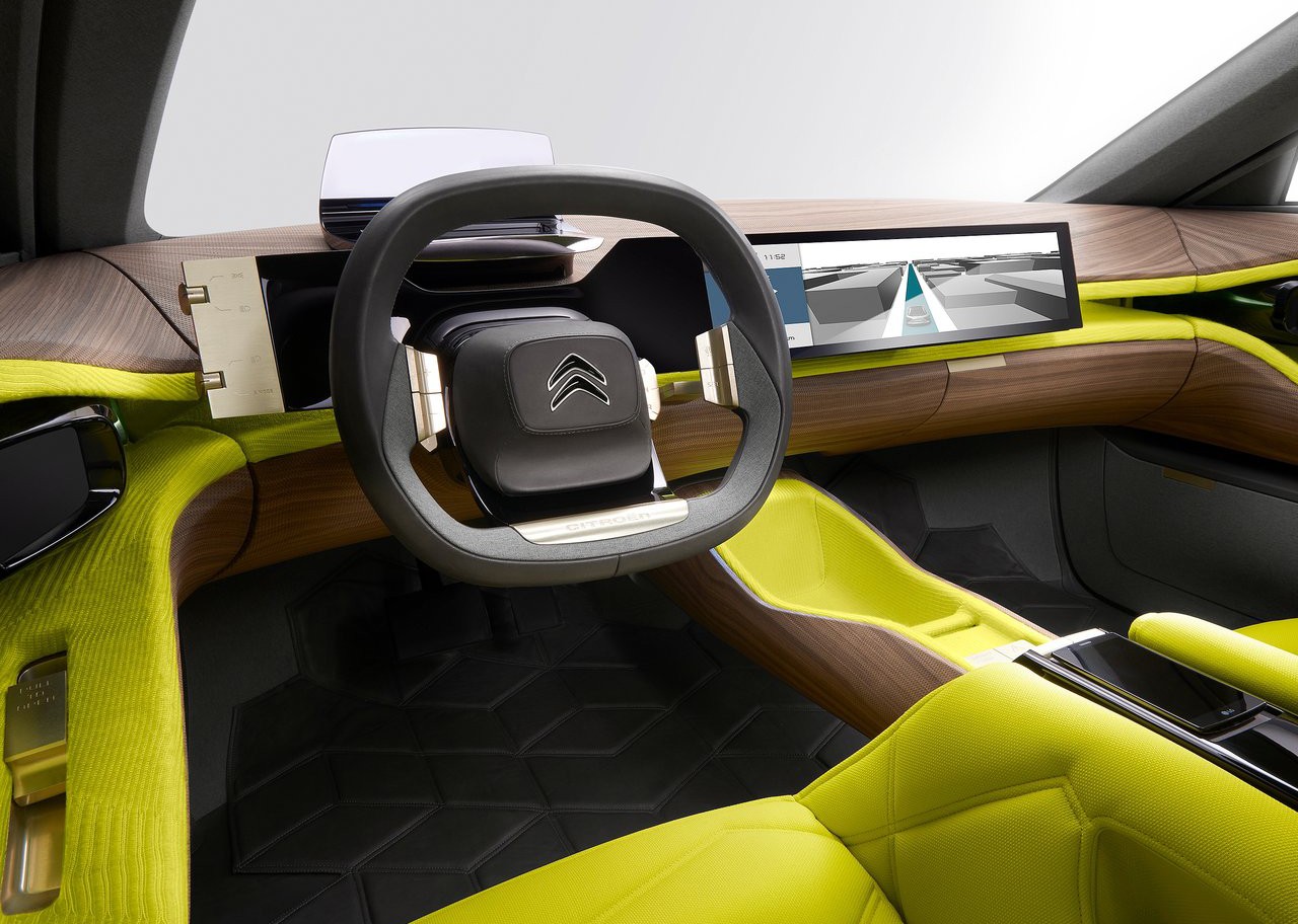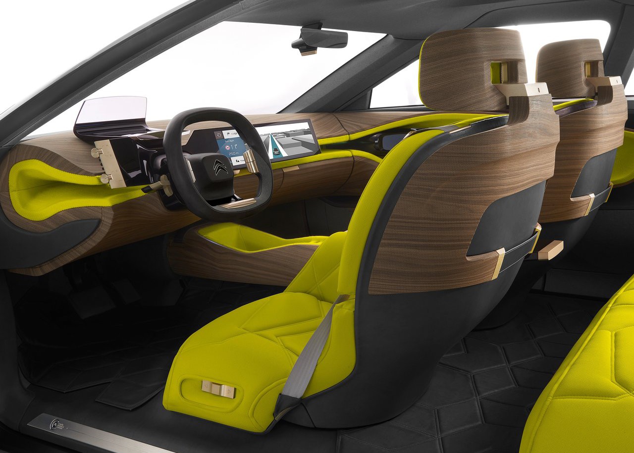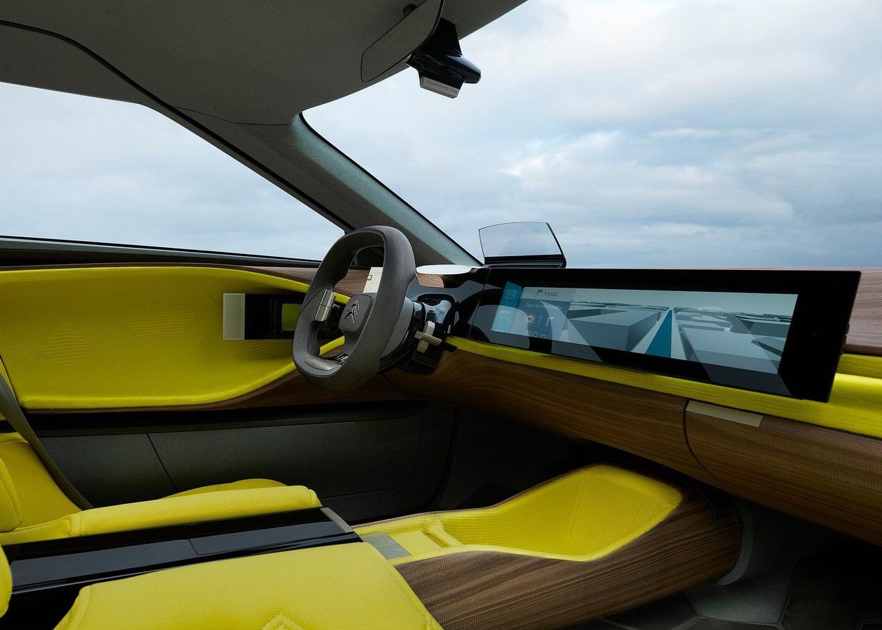 The interior of the Citroën Cxperience is futuristic-minimalist, yellow upholstered and with accessories walnut wood. The central part is otherwise a dashboard with a floating 19-inch screen (allowing it to be divided into two windows in different proportions or fully unfolded), and the rear passengers manage things via a tablet.