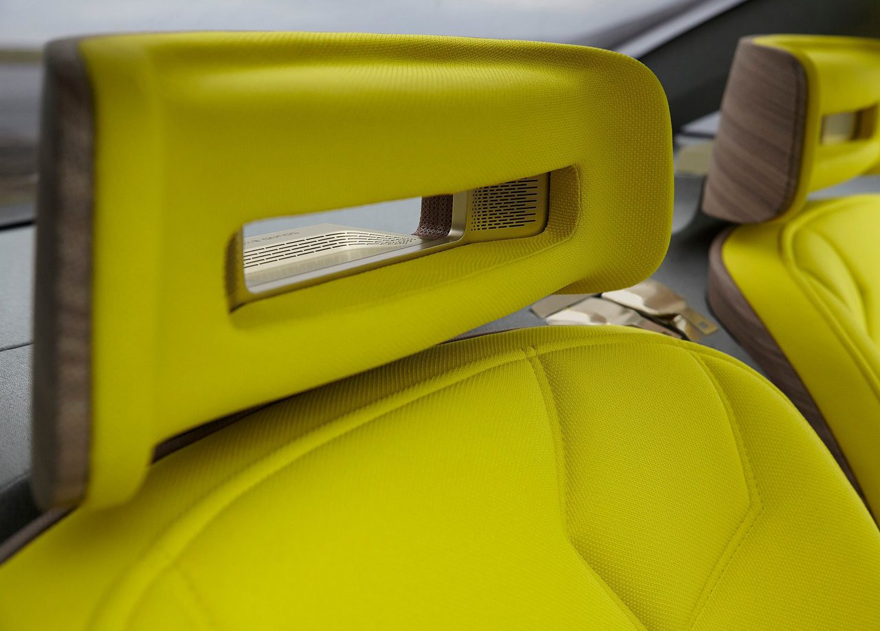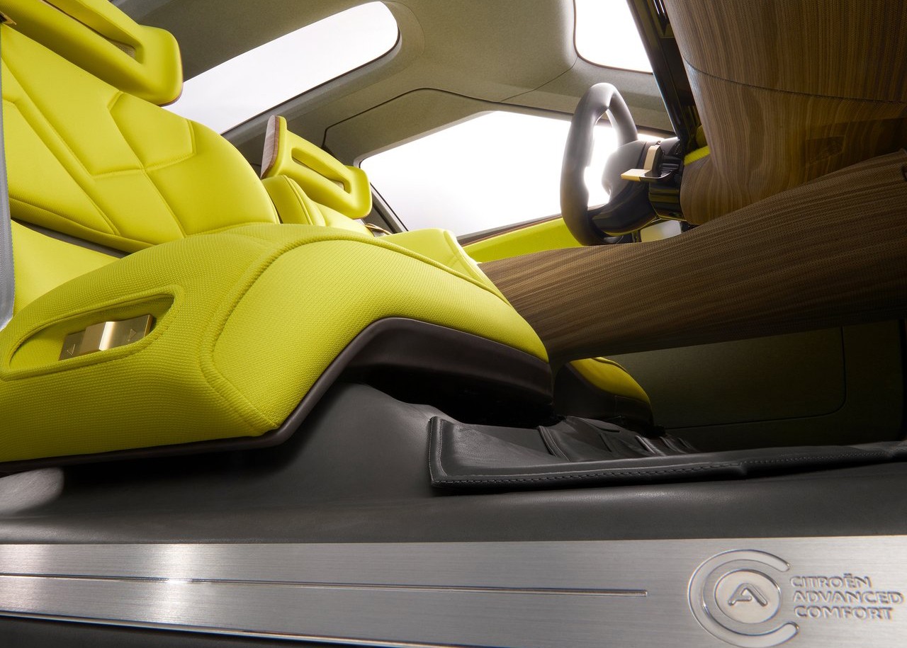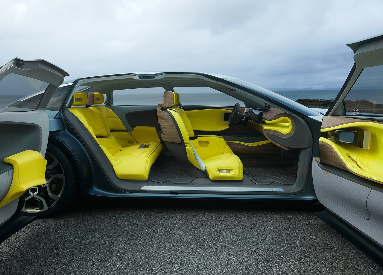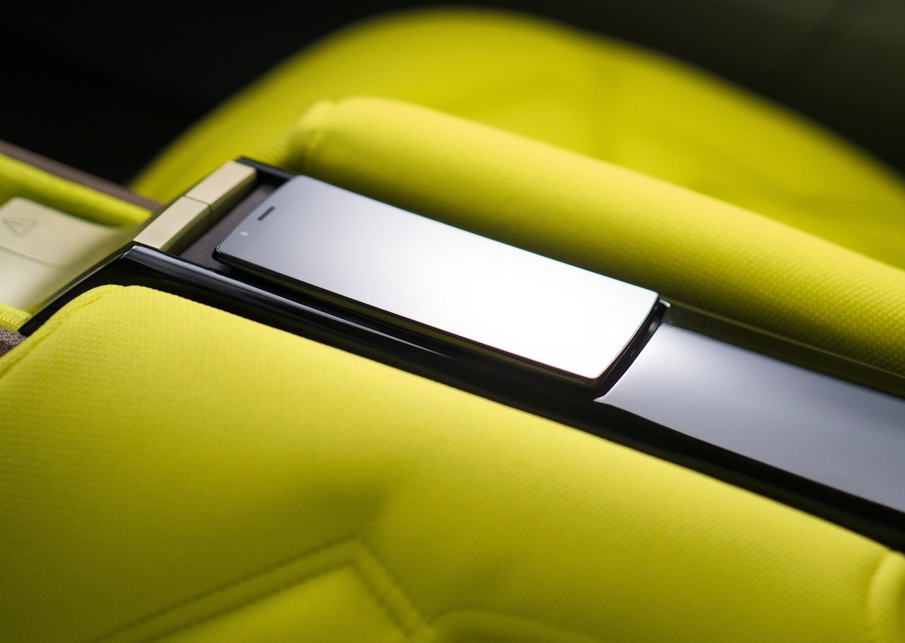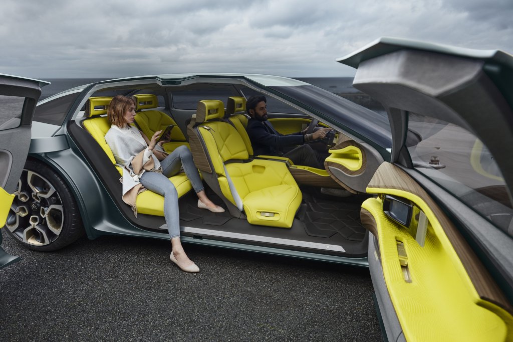 The interior of the Citroën Cxperience is futuristic-minimalist, yellow upholstered and with accessories walnut wood. The central part is otherwise a dashboard with a floating 19-inch screen (allowing it to be divided into two windows in different proportions or fully unfolded), and the rear passengers manage things via a tablet.