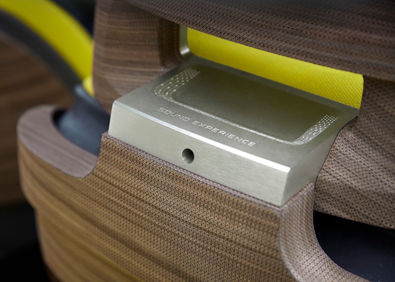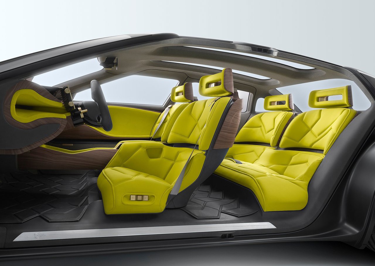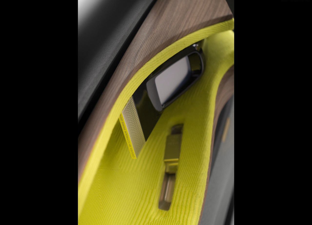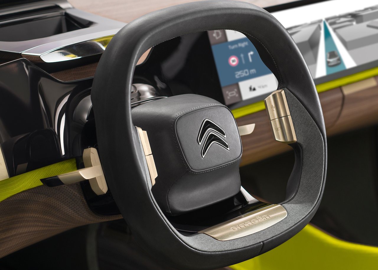 The interior of the Citroën Cxperience is futuristic-minimalist, yellow upholstered and with accessories walnut wood. The central part is otherwise a dashboard with a floating 19-inch screen (allowing it to be divided into two windows in different proportions or fully unfolded), and the rear passengers manage things via a tablet.