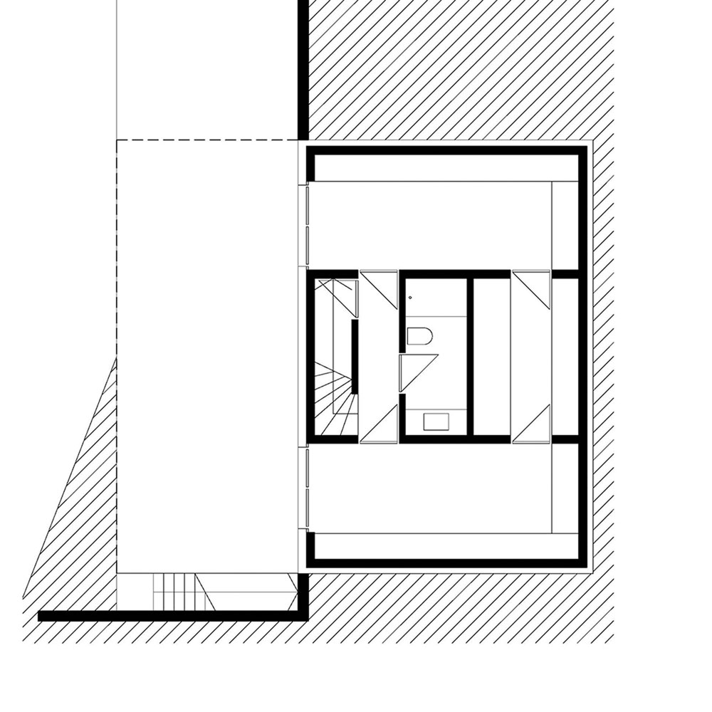 The biggest limitations in designing the building were the sloping terrain and the dense surrounding buildings. The architects wanted to leave as much of the building plot as possible empty. With the help of two cantilever volumes, they managed to minimize the floor plan of the building to only 33 square meters, otherwise the building has 180 square meters of living space. The building acts as if it is only lightly touching the terrain, and the two cantilevers create a covered outdoor area – one at the basement level, which opens up to nature, and one at the street level, which serves as a canopy over the parking lot and the entrance.
