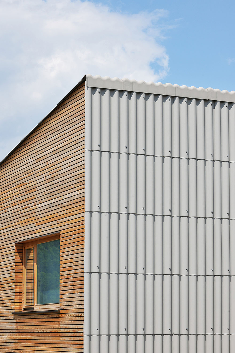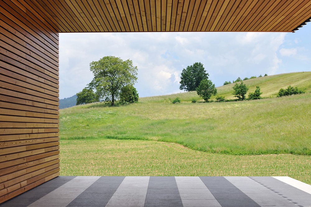 The privacy of the building's premises increases with the floors; the father's office and children's playroom are located in the basement, the ground floor is intended for living spaces, and the first floor is for bedrooms. Structurally, the building is designed in a combination of reinforced concrete and wood. In addition to the speed and ease of construction, the decision to implement a wooden structure was also supported by the desire for sustainable construction. As we know, Slovenia is extremely rich in wood, and at the same time staying in a wooden building is extremely pleasant. The northern and southern facades are clad in wooden paneling and open to the beautiful landscape with large windows. On the other hand, due to the proximity of the neighboring buildings, the eastern and western facades are closed as much as possible and covered with corrugated cement sheets, with which the roof is also covered.