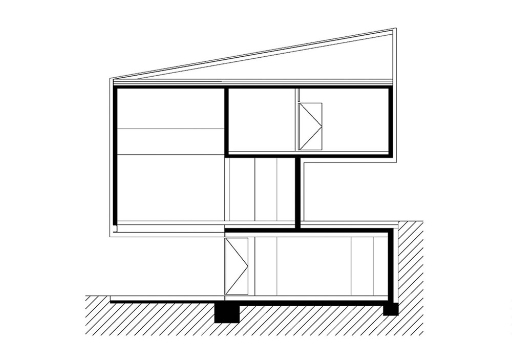 The biggest limitations in designing the building were the sloping terrain and the dense surrounding buildings. The architects wanted to leave as much of the building plot as possible empty. With the help of two cantilever volumes, they managed to minimize the floor plan of the building to only 33 square meters, otherwise the building has 180 square meters of living space. The building acts as if it is only lightly touching the terrain, and the two cantilevers create a covered outdoor area – one at the basement level, which opens up to nature, and one at the street level, which serves as a canopy over the parking lot and the entrance.