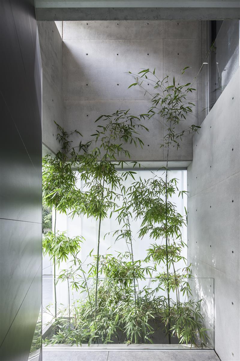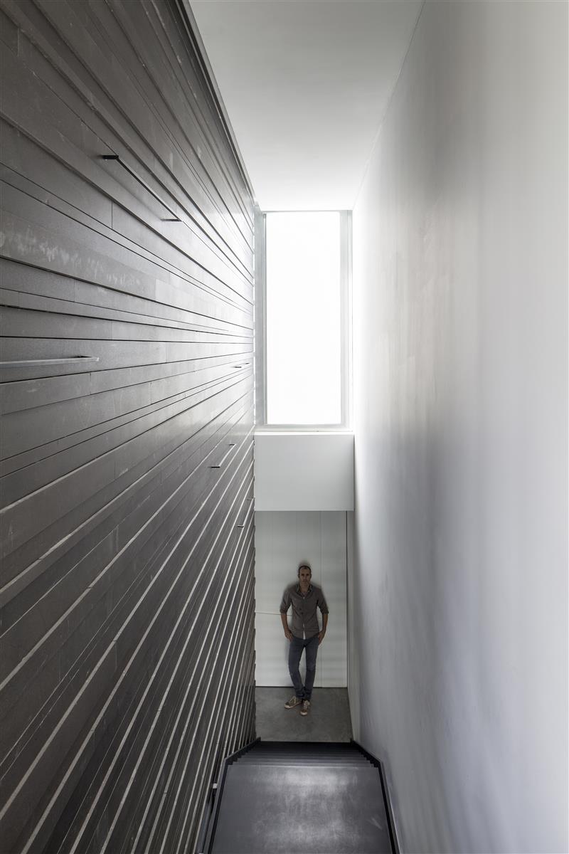 The glass-concrete combination offers different levels of privacy, because while on the south side this two-story house plays "nudist", on the north side it is a pure "tangle". In front of the living area and just behind the panoramic sliding walls, there is a wonderful flourish outdoor pool, and on the upper floor there are bedrooms and a cabinet. The "public" stairs lead to the upper floor, which they escort glass panels embedded in concrete, and all rooms are dressed in minimalism from head to toe. Color in monochromatic atmosphere indoor plants and individual furniture elements are introduced, while the strict minimalism is also softened by the green outdoor surroundings.