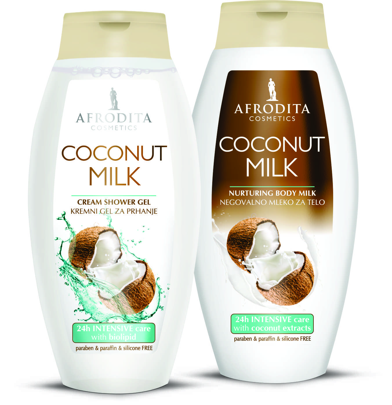 - Creamy shower gel and COCONUT MILK body care milk for a tropical experience of daily care and