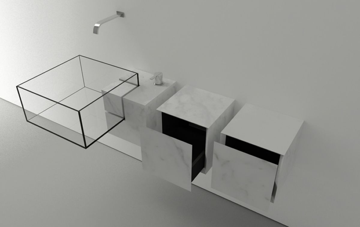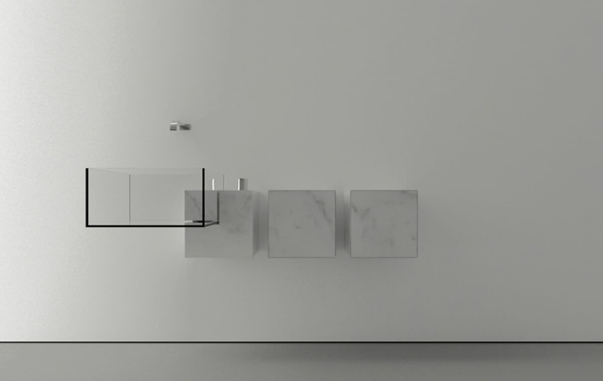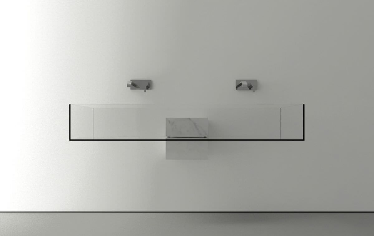 The sink itself is made of (probably) hardened glasses, like car windows, while the bracket, which can also be a cabinet, from Carrara marble thus combining aesthetics and functionality. It is available single or double sink.