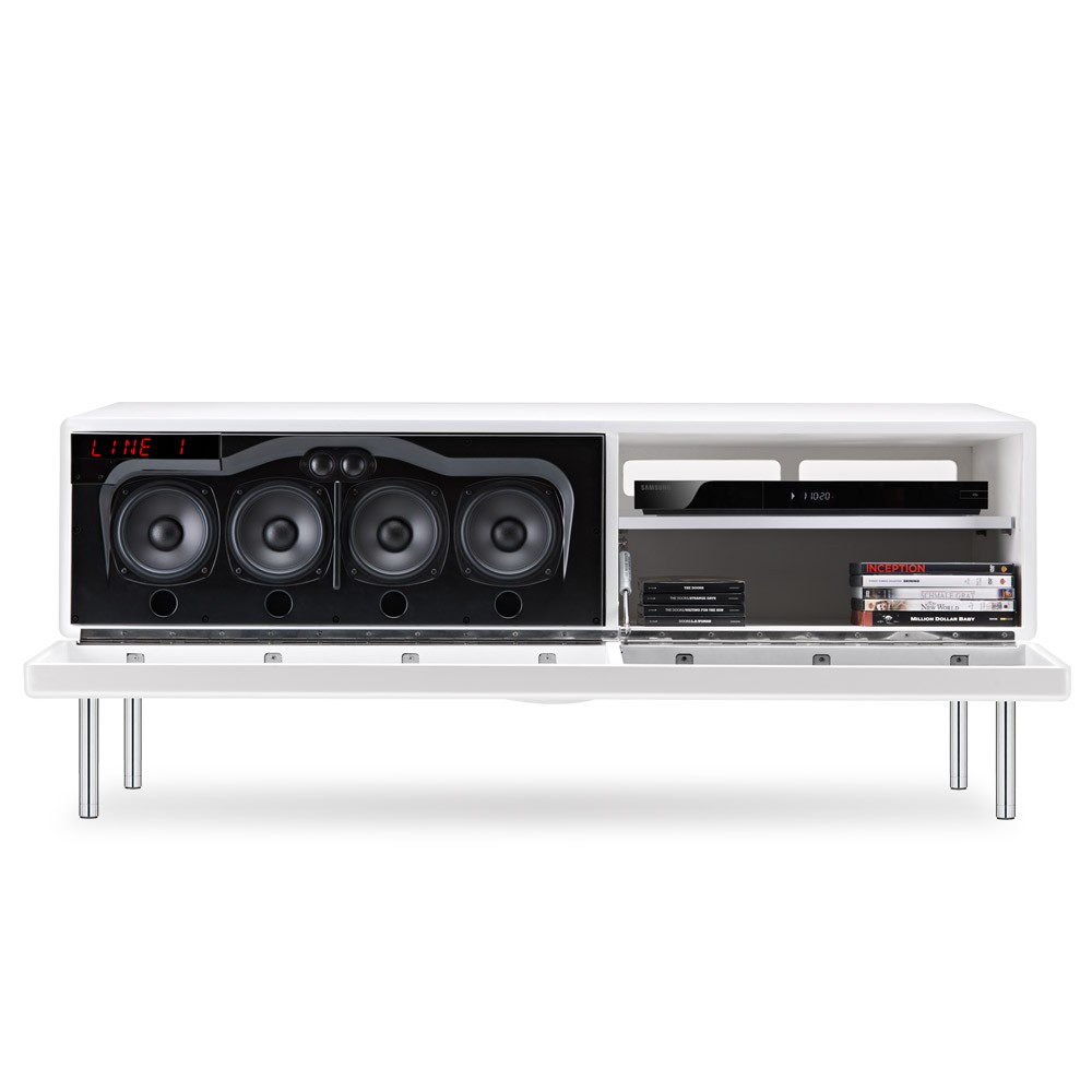 A TV stand and speaker system in one is called Geneva XXL Sound System. With several years of development, they are with the company Geneva have created an elegant piece of furniture that holds TVs up to 165 centimeters in size, while providing quality sound through seven built-in speakers. There is also enough space inside to store your favorite movies or music. Thanks to connectivity with Bluetooth technology and Apple's AirPlay, it allows playing music without directly connecting the device.