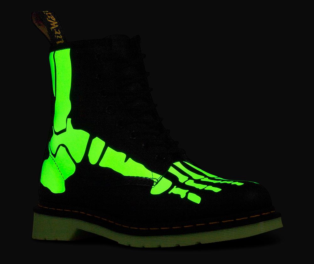 dr. Martens has introduced a glow-in-the-dark version of its famous 1460 bull boots. Ankle boots Dr. Martens Skelly have a photoluminescent leg skeleton motif and a luminous sole.