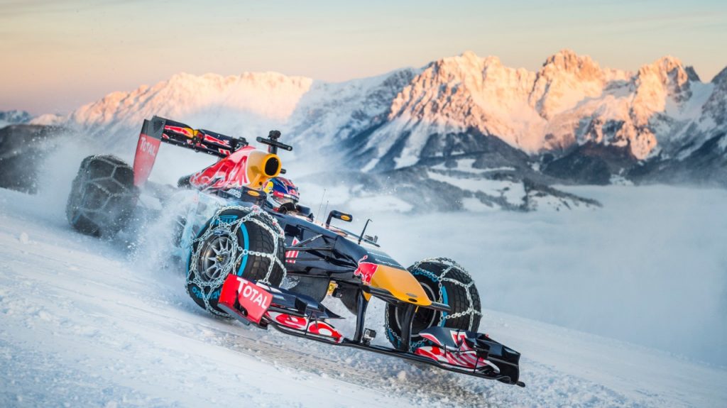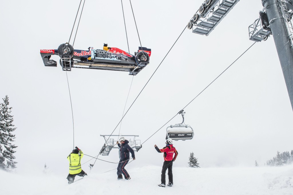 Red Bull already sent his car to the ice in 2010, with which the team then celebrated the return of the Canadian Grand Prix to the F1 calendar, but this time he also prepared a show for gourmands. In a famous ski resort Kitzbühel under the mountain Hahnenkamm sent a car to the ski track Red Bull RB7 from 2011 and equipped it with chains for easier maneuvering between the gates.