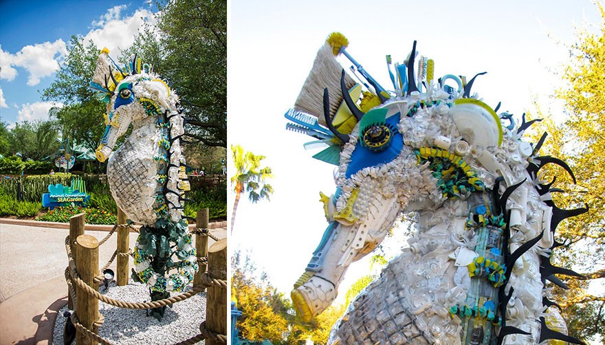Sculptures from marine debris are the work of an Oregon organization Washed Ashore, and Xandi Kreuzeder added two. Exciting works are admonition and criticism excessive use of plastic, which is the 'plague' of our planet; all the material to make these fascinating sculptures came from the seashore and not from art supply stores.