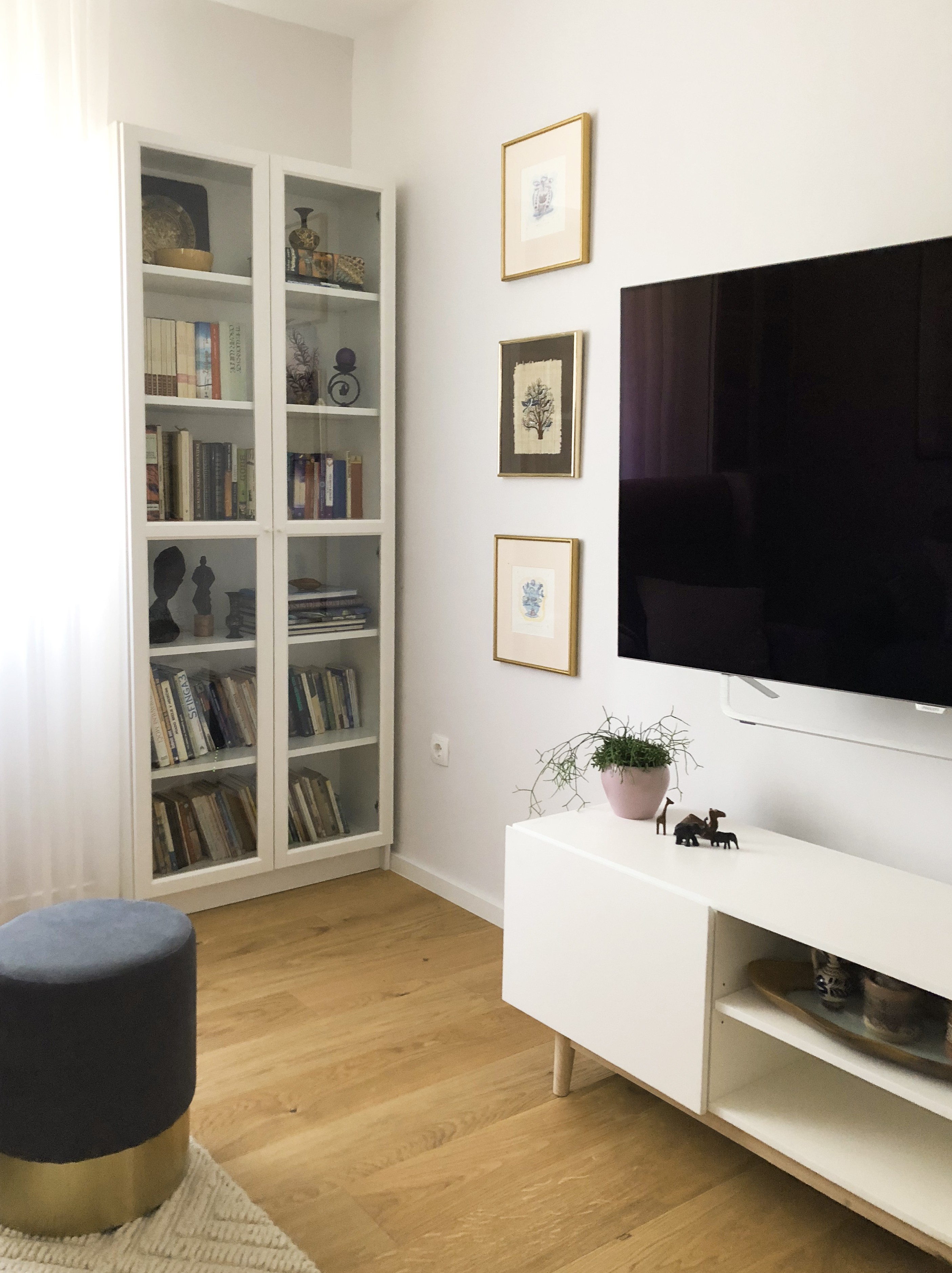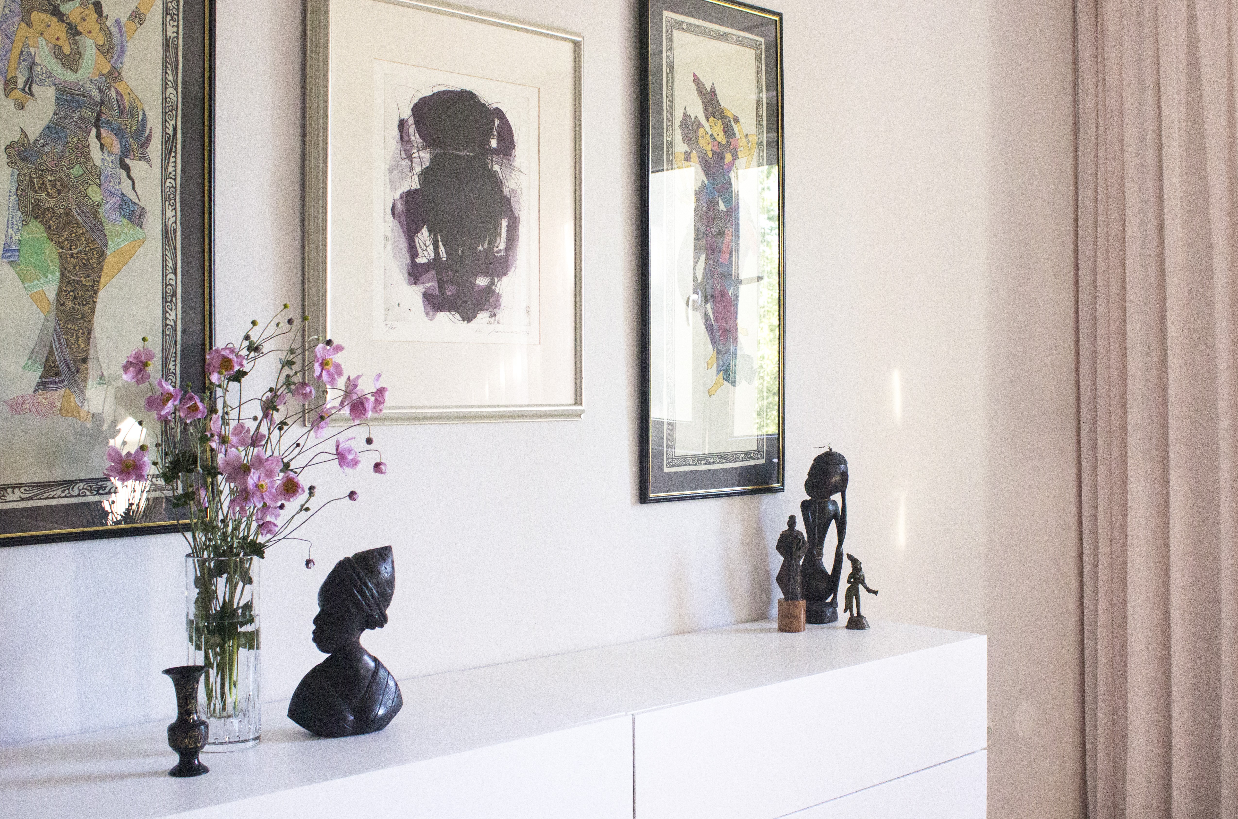 The apartment turned into elegant gallery. Each room has a corner or part of the wall dedicated to works of art, such as pictures, statuettes and vases, which the lady has been collecting for many years. Many objects are carefully displayed in showcases and on open shelves and so they tell her stories from her travels around the world and bring back precious memories from the past.