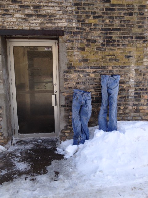 And how the pants stand up by themselves? Before people put them out in the cold, them soaked in water and form during freezing. Would you show off your extra jeans like this?
