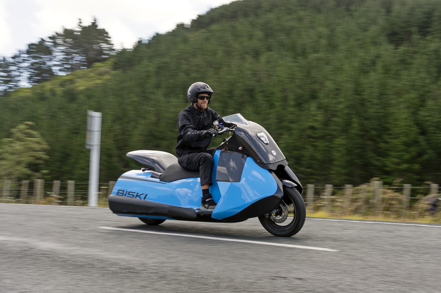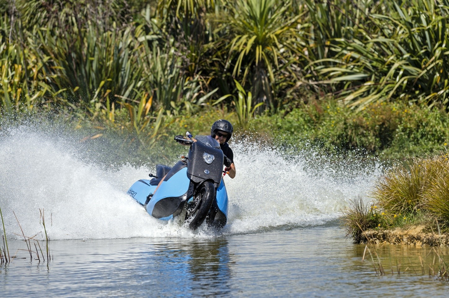 Gibbs Bisky it's already a bit unusual to look at, especially if we compare it to modern maxi scooters. That's how it should be, because Biski can go also on water and is not bound only to the asphalt base. It drives him 2-cylinder engine with 55 horsepower, which sprouts on the land of Bisca up to 130 km/h, and up to 60 km/h in water. Biski has a special exhaust system that is divided into four pipes. He uses two for driving on the road, and the other two for sailing on water. Biski uses hydraulic brake system and has v fully folding suspension, which is again required by the water conditions.