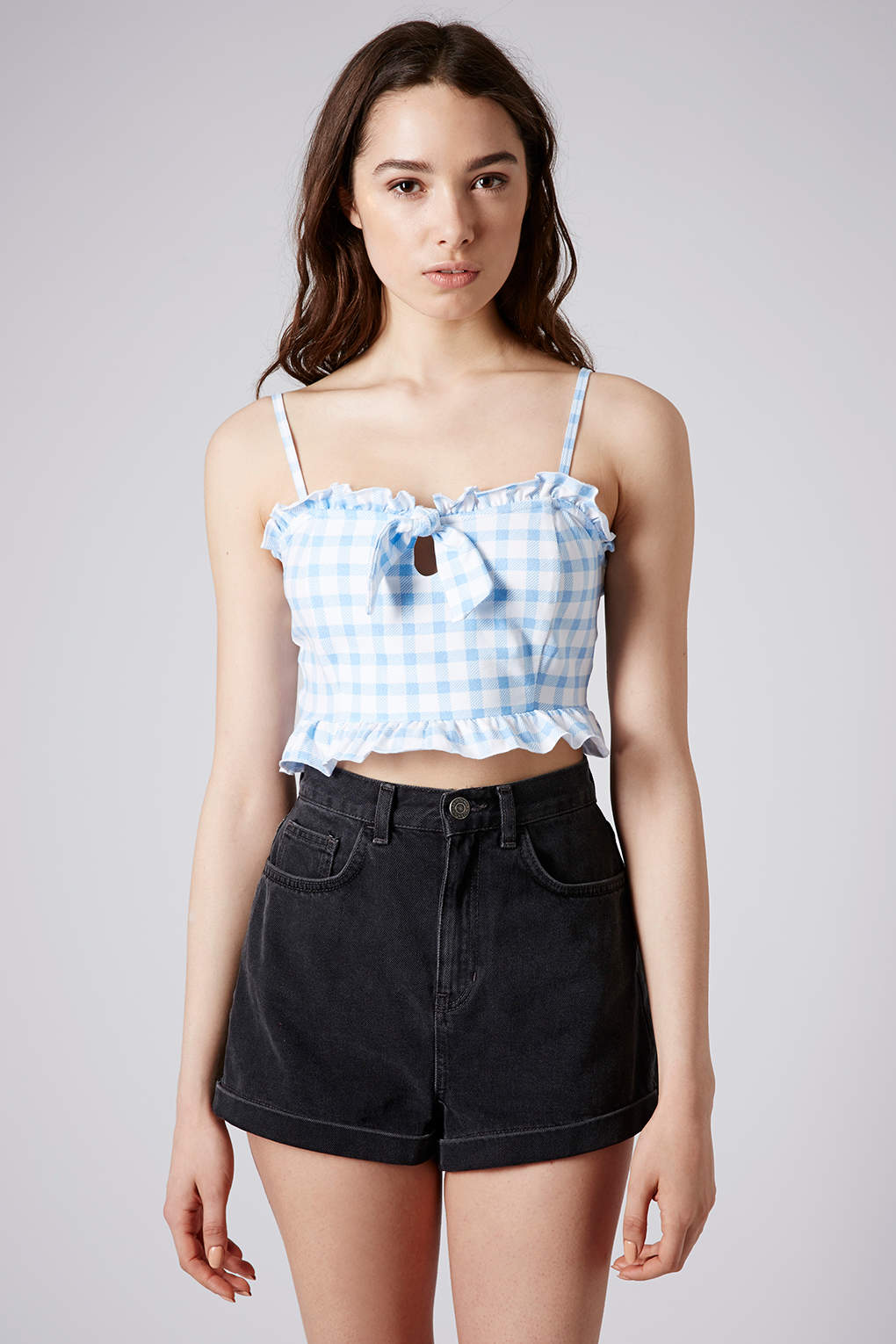 We will enchant this summer season dressed in "gingham" high-waisted shorts, full A-line skirt, fringed cigarette pants, peplum crop top and two-piece swimsuit with cute bows.