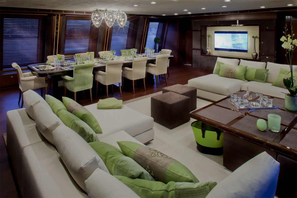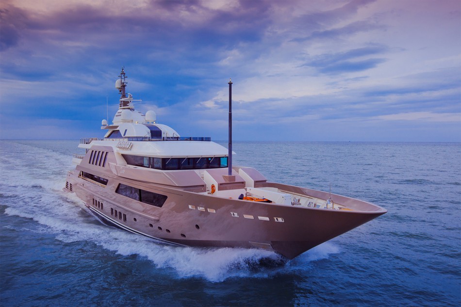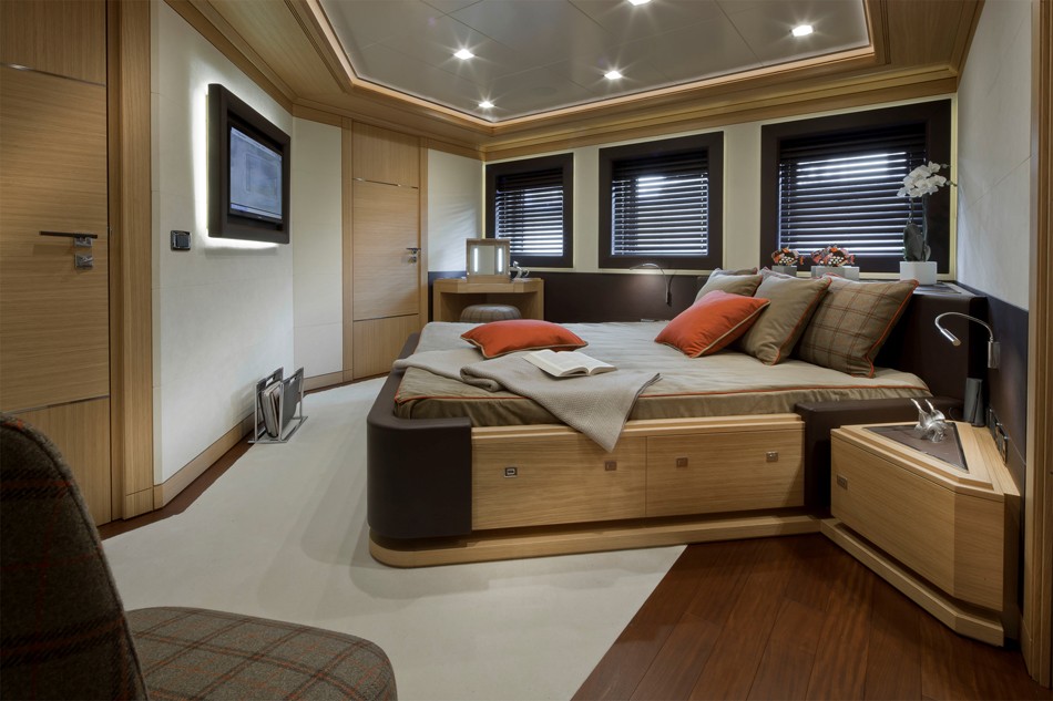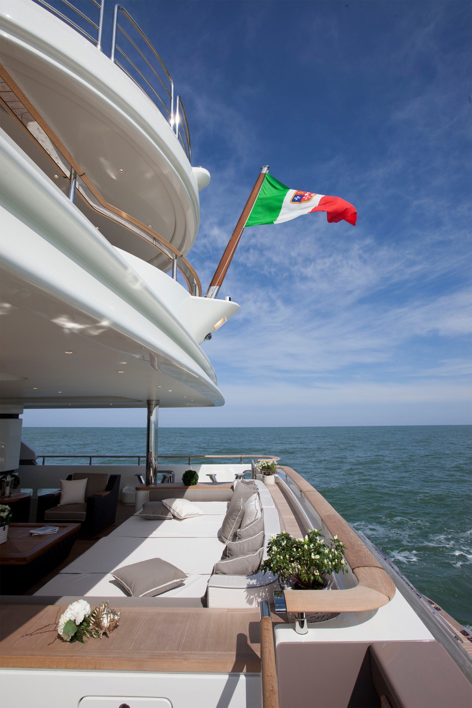 J'Ade can do up to 16 knots (30 km/h) and enables a trans-Atlantic voyage. Around the hips it's for her 10.2 meters, and as mentioned, it measures 60 in length. Inside it rests modern design, which is a combination of wood, leather, marble and metal, and the whole ship's color gravitates towards white jade (semi-precious stone). It has 115 thousand liter tank and produces daily 18 thousand liters of drinking water. It has four cabins for two and one suite for the owner. Of course, there is no shortage of sun terraces and everything they have to offer prestigious apartments or hotels.