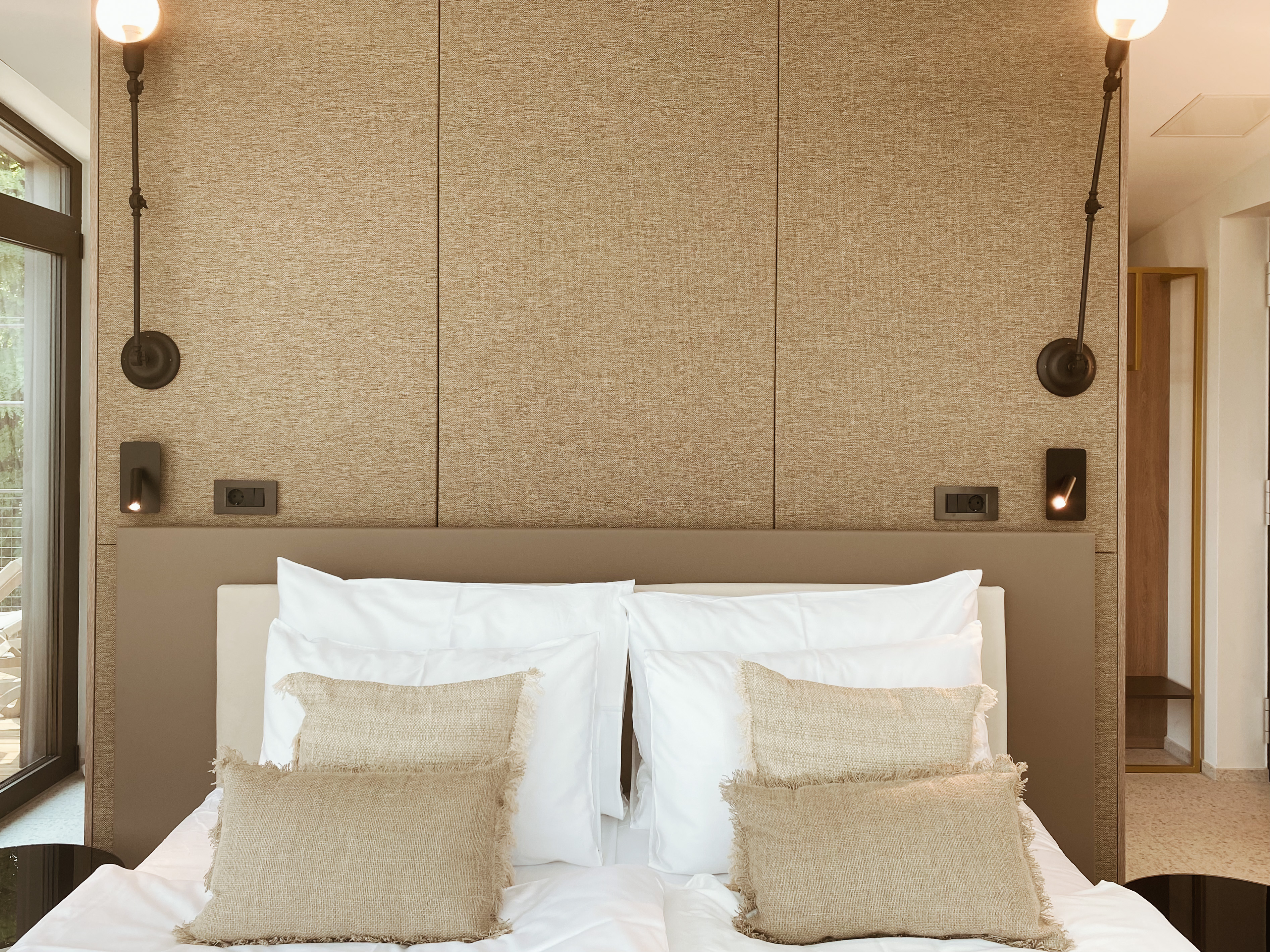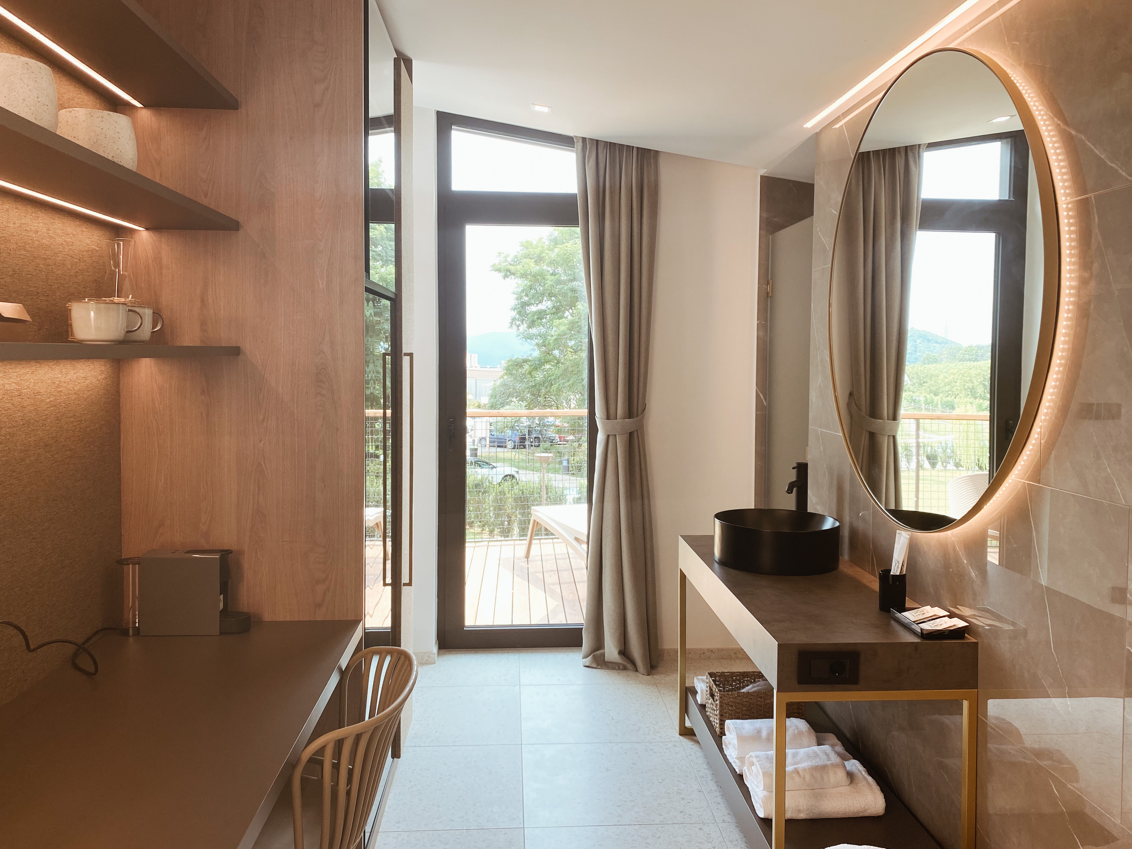 You can choose between Deluxe Suite and Deluxe room, the first extends to 37 m2, the second measures ten less. The Deluxe Suite boasts a double bed and a spacious living room where an extra bed can be arranged. It has its own bathroom and a large terrace with a wonderful view of the surrounding nature. It is equipped with everything you need for a comfortable vacation, from a coffee machine to air conditioning, a TV and a wine fridge.